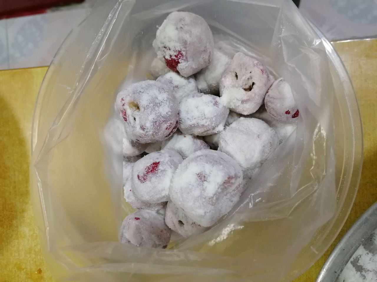 步骤3、手粘奶粉,把每个山楂球团圆,然后放入奶粉中防止粘连,网上是带手套,但是实际操作过程中,还是手粘奶粉更方便,同时减少了塑料的使用,更健康