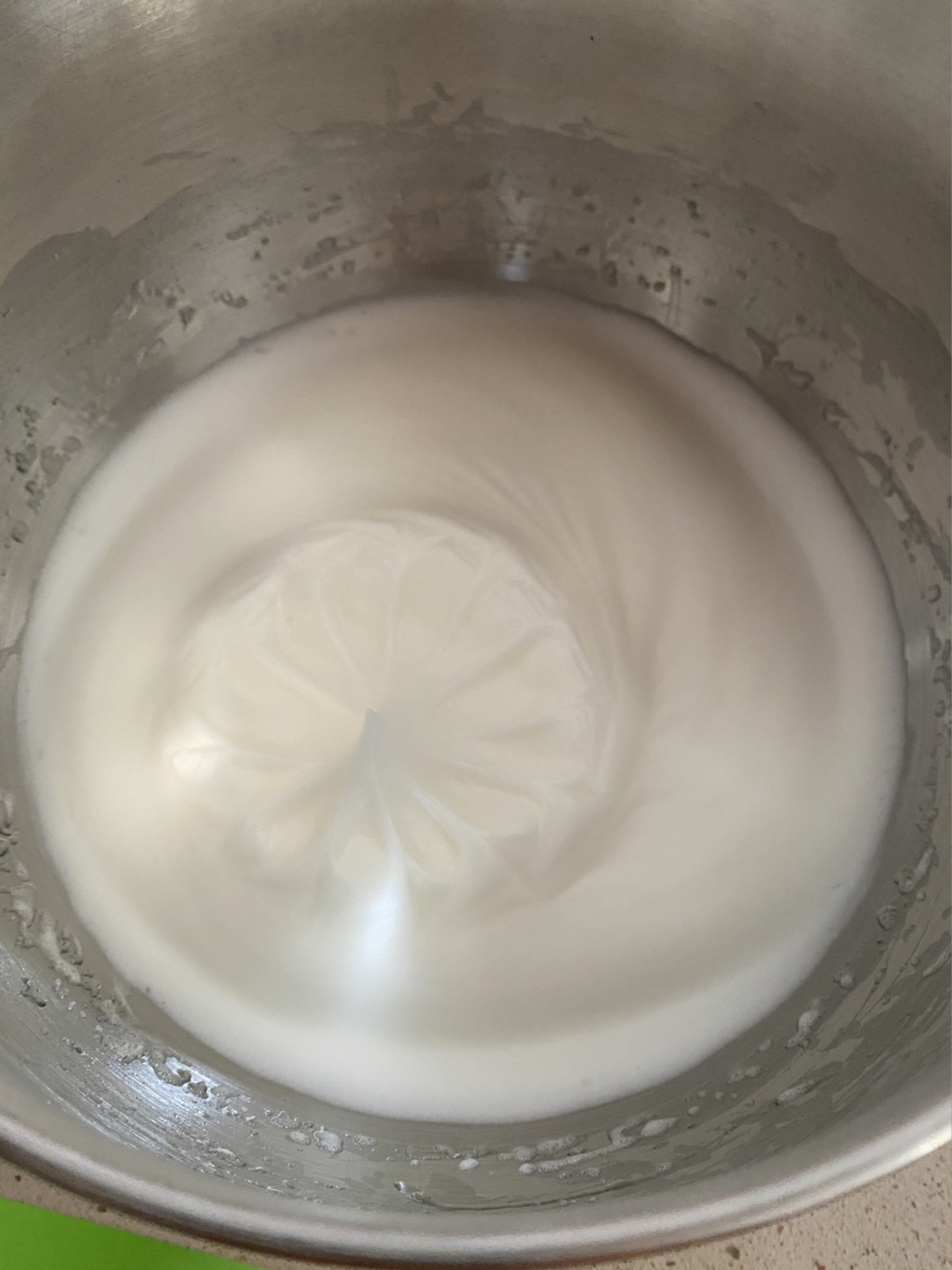 步骤5、加入几滴柠檬汁,分三次加入白砂糖打发蛋白至小尖尖状态