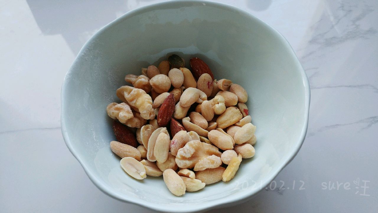 步骤1、根据个人喜好选坚果,比如去皮花生巴旦木什么的