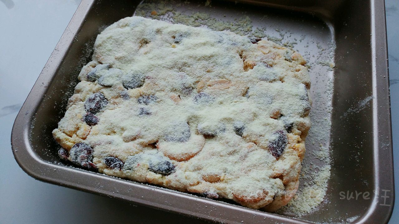 步骤7、挪出锅趁热拉叠几下,搁到提前撒了层奶粉的方形模具/烤盘里努力整方撒奶粉