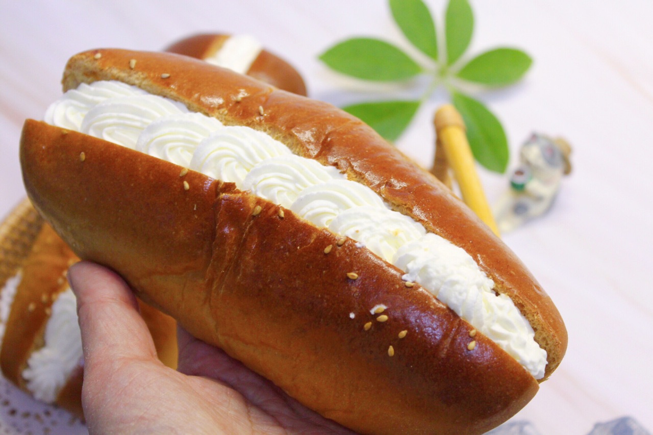 步骤13、烤好的面包放凉后,从中间切开,将淡奶油加糖打发装入裱花袋,挤到面包中间;