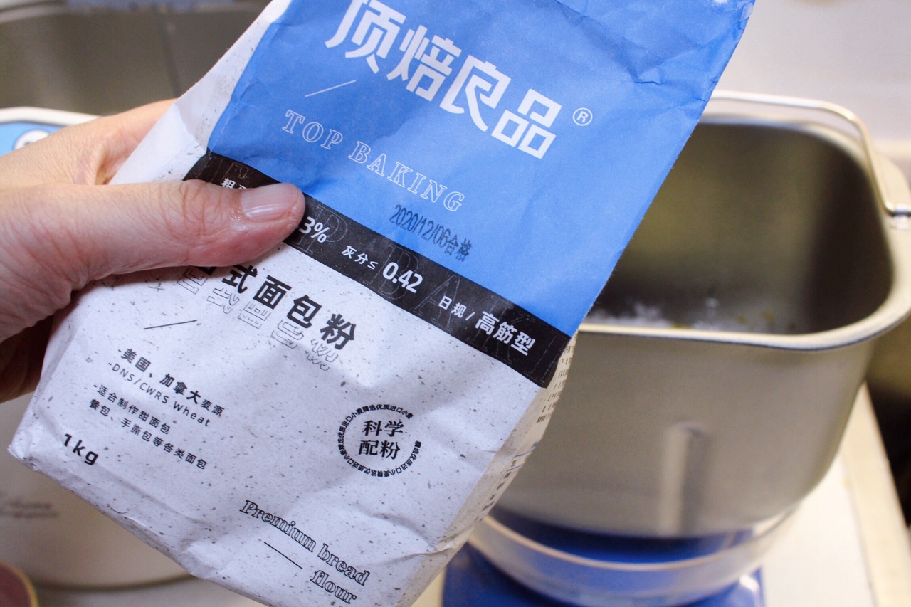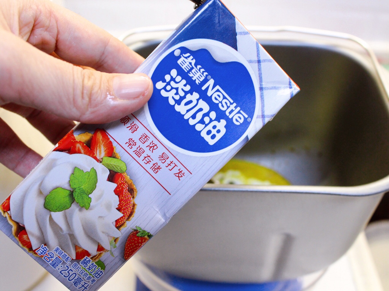 辅料:盐2克、热水20毫升、鸡蛋1个、牛奶50毫升、酵母4克、淡奶油25克、黄油15克、淡奶油150克、糖粉15克