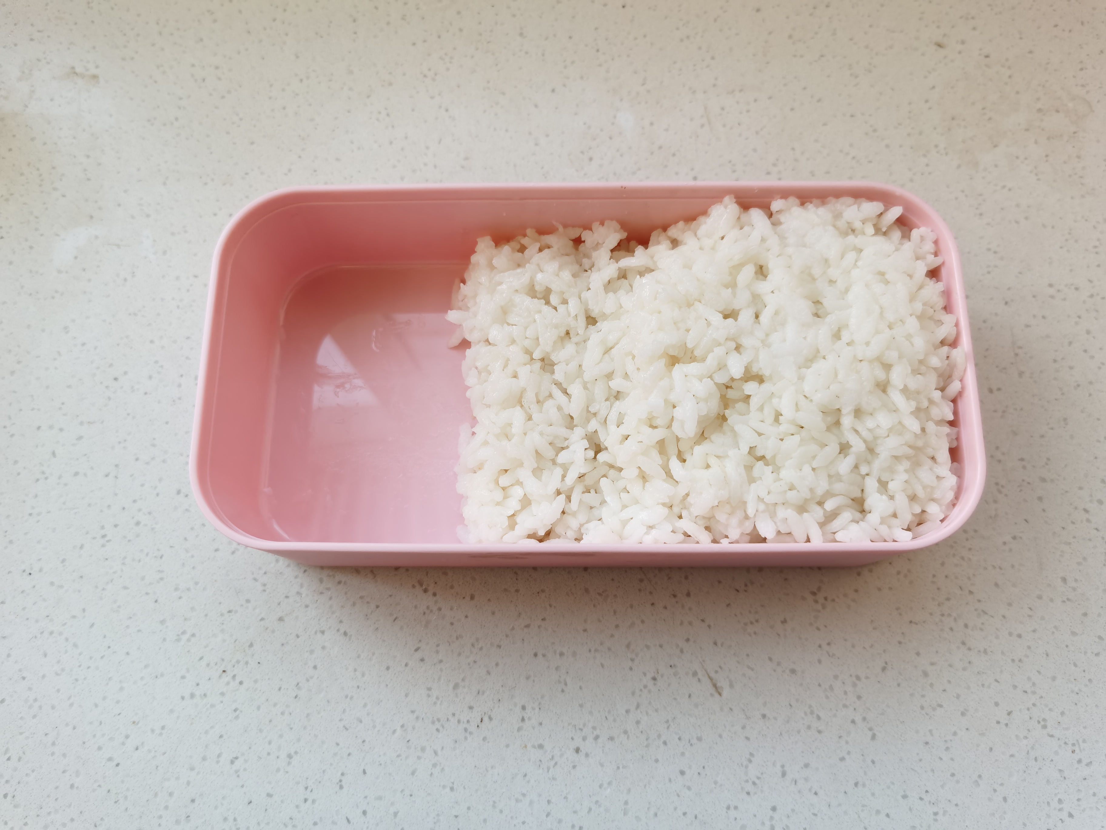 步骤12、将米饭放进便当盒中,要给米饭压成一个阶梯状,那个阶梯的地方正好摆放鱼块,在将其他配菜摆放进去。还可以选择一些你心仪的配菜点缀,摆放没有硬性规定哦,完全按你心意就好