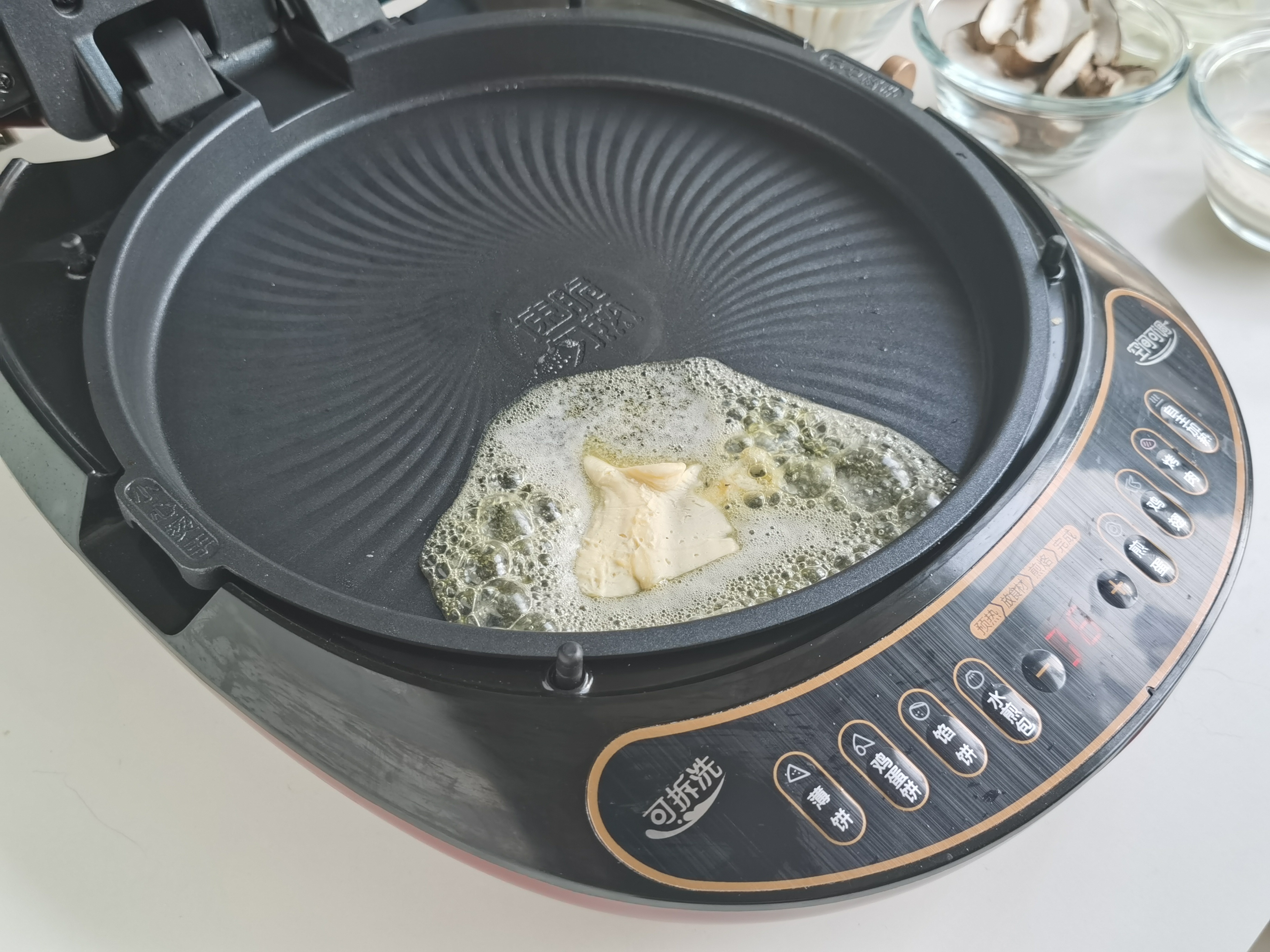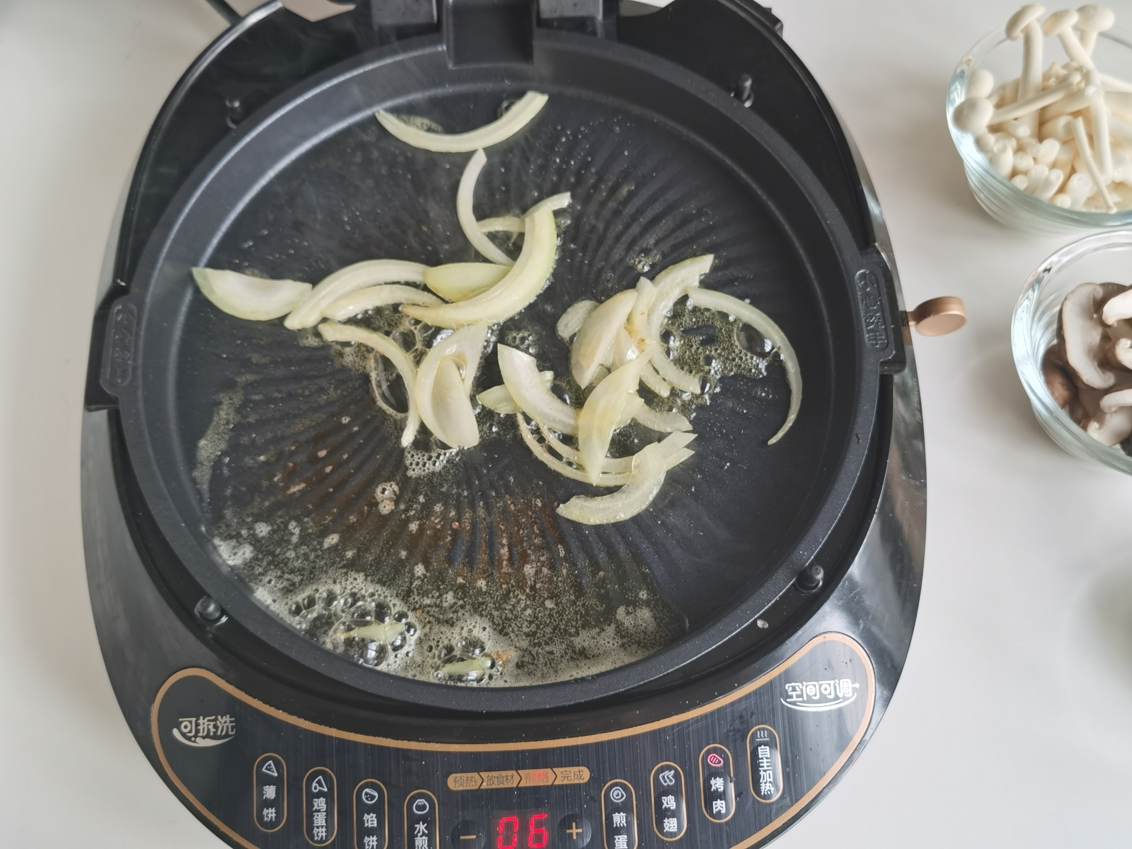 步骤9、加入切好的白玉菇与香菇,美的煎烤机控温很好,不用大力翻炒,盖上上烤盘就好