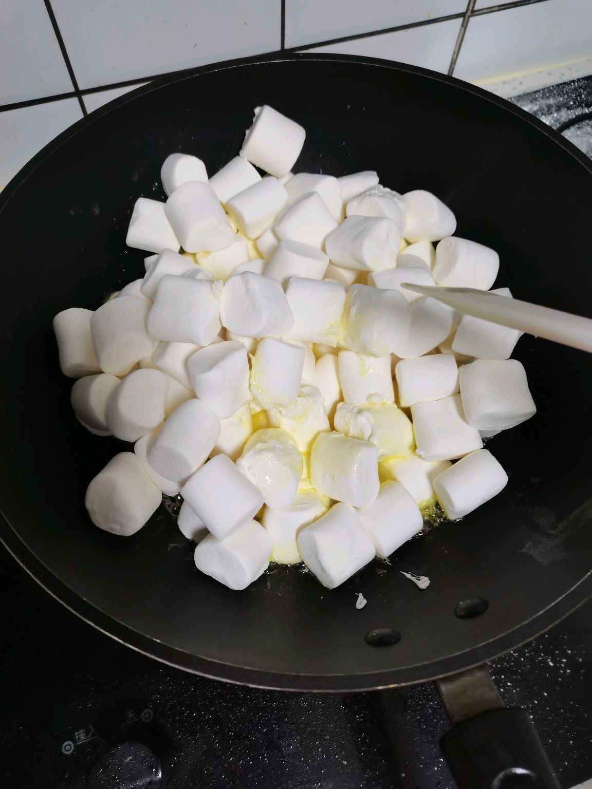 步骤2、到入棉花糖翻炒至棉花糖完全融化。