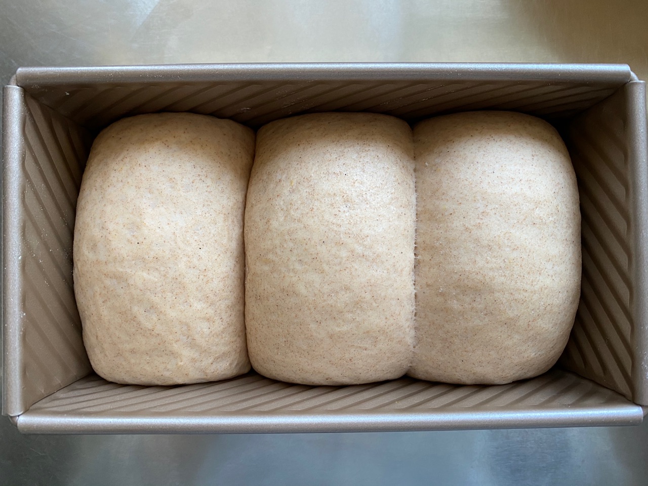 步骤15、把卷好的面团放进450克的吐司盒中,一共放3个,不用盖吐司盒的盖子