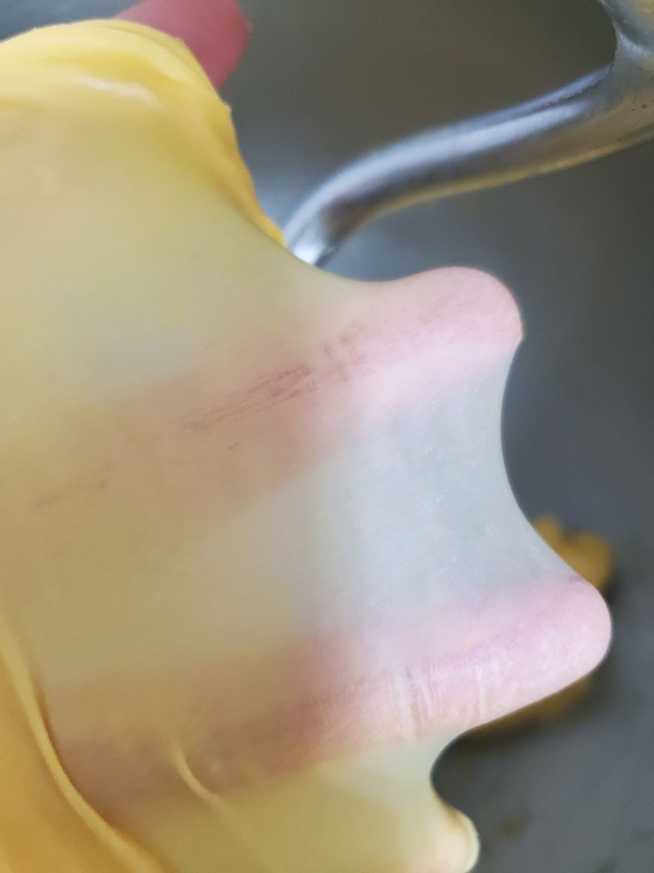 步骤2、搅拌成七分筋加软化黄油刚开始低速搅拌黄油吸收后调高速