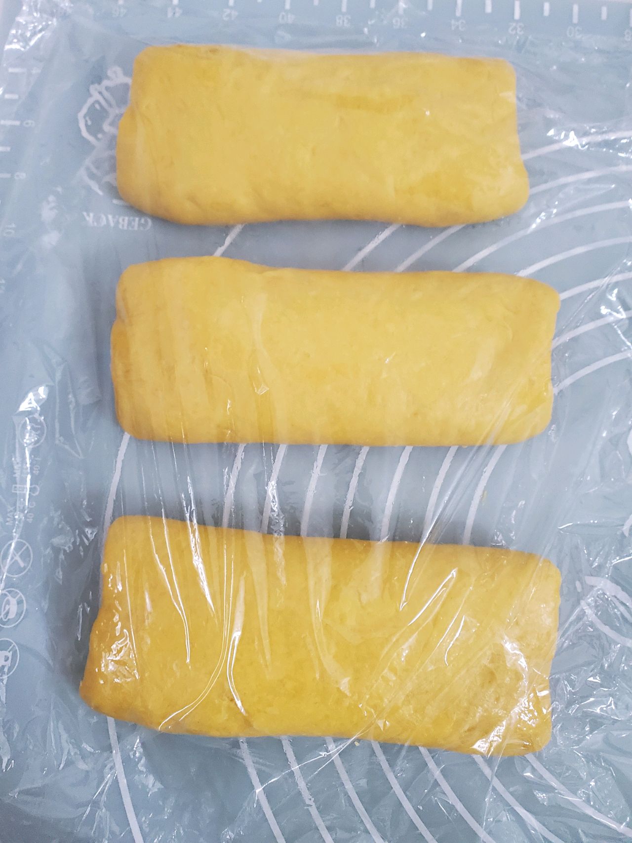 步骤5、发酵好后取出来,排气分成三份松弛15分钟