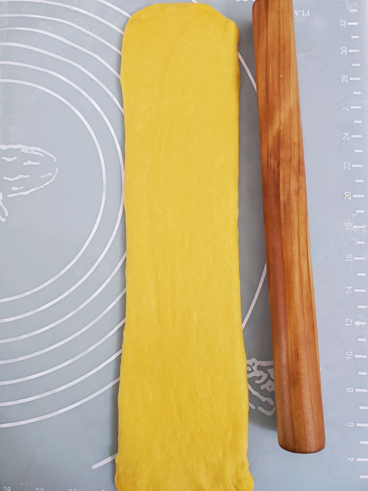 辅料:南瓜泥100g、鸡蛋液40克、牛奶40g、淡奶油20克、白糖25g、盐3克、酵母3克、黄油18g