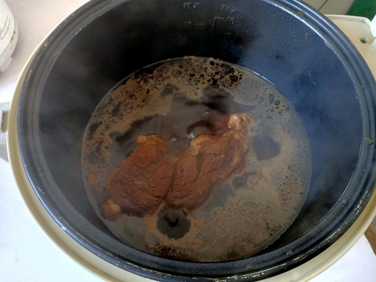 步骤2、电饭锅加水没过牛肉,下香料和调料。