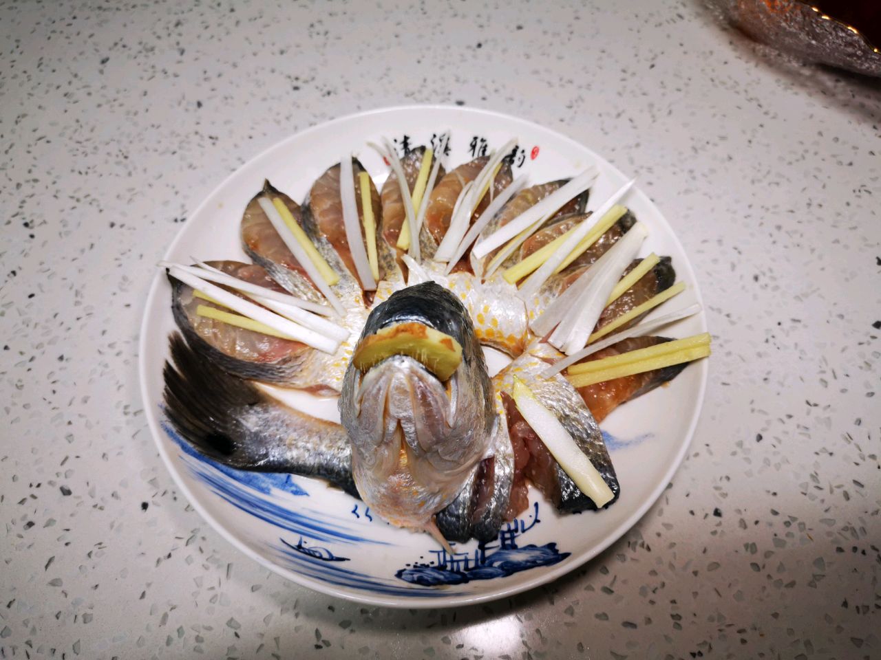 步骤4、腌好的黄花鱼放进盘里把切开的鱼肉一片连着一片摆好把洗净的鱼头塞上一片姜摆在鱼肉中间像孔雀开屏那个样子重新放上葱姜丝上蒸锅
