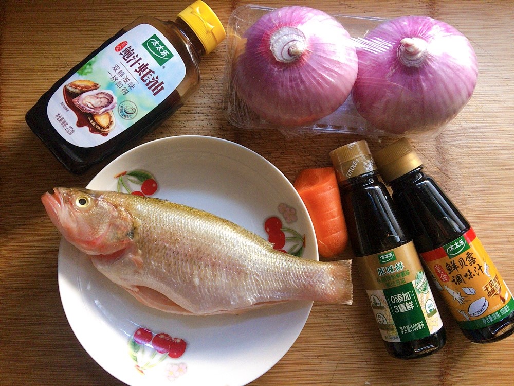 步骤1、主要食材如图所示示意,鲈鱼一只、洋葱、胡萝卜等