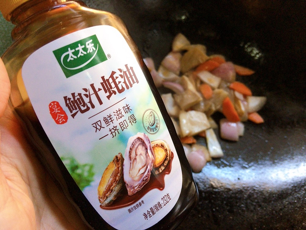 辅料:洋葱半颗、凤尾菇适量、姜适量、太太乐鲍汁蚝油2挤、太太乐蔬之鲜1/2勺、太太乐鲜贝露1/2勺、太太乐鸡精1/2勺