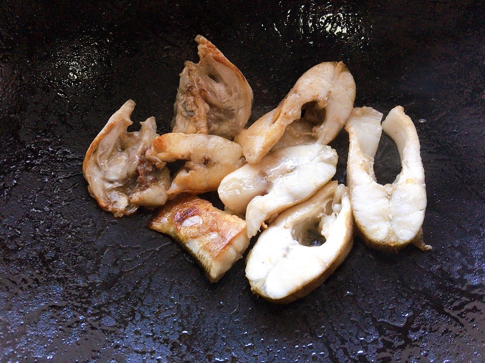 步骤5、皮先煎至定型,会将鱼肉“拉拢”起来不易散,而后鱼块的截面,在接触锅底煎,煎制成熟出锅备用。