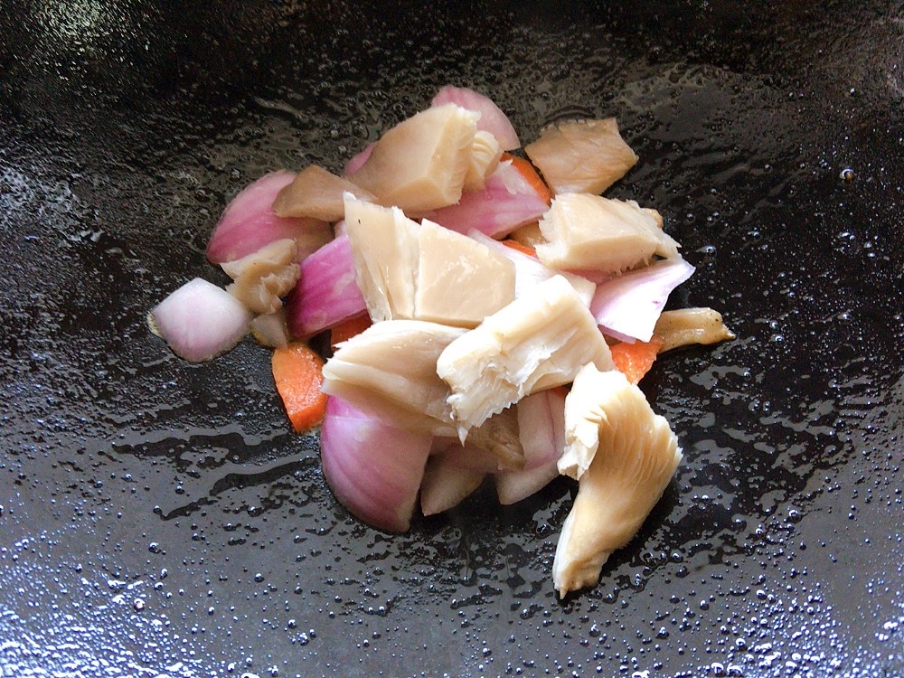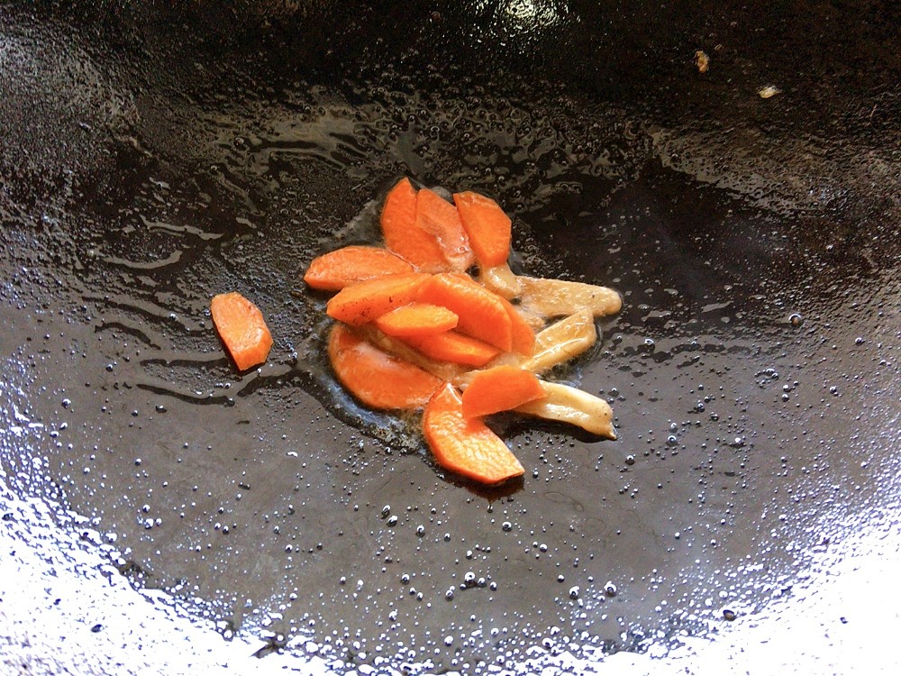 步骤7、而后加入胡萝卜片翻炒
