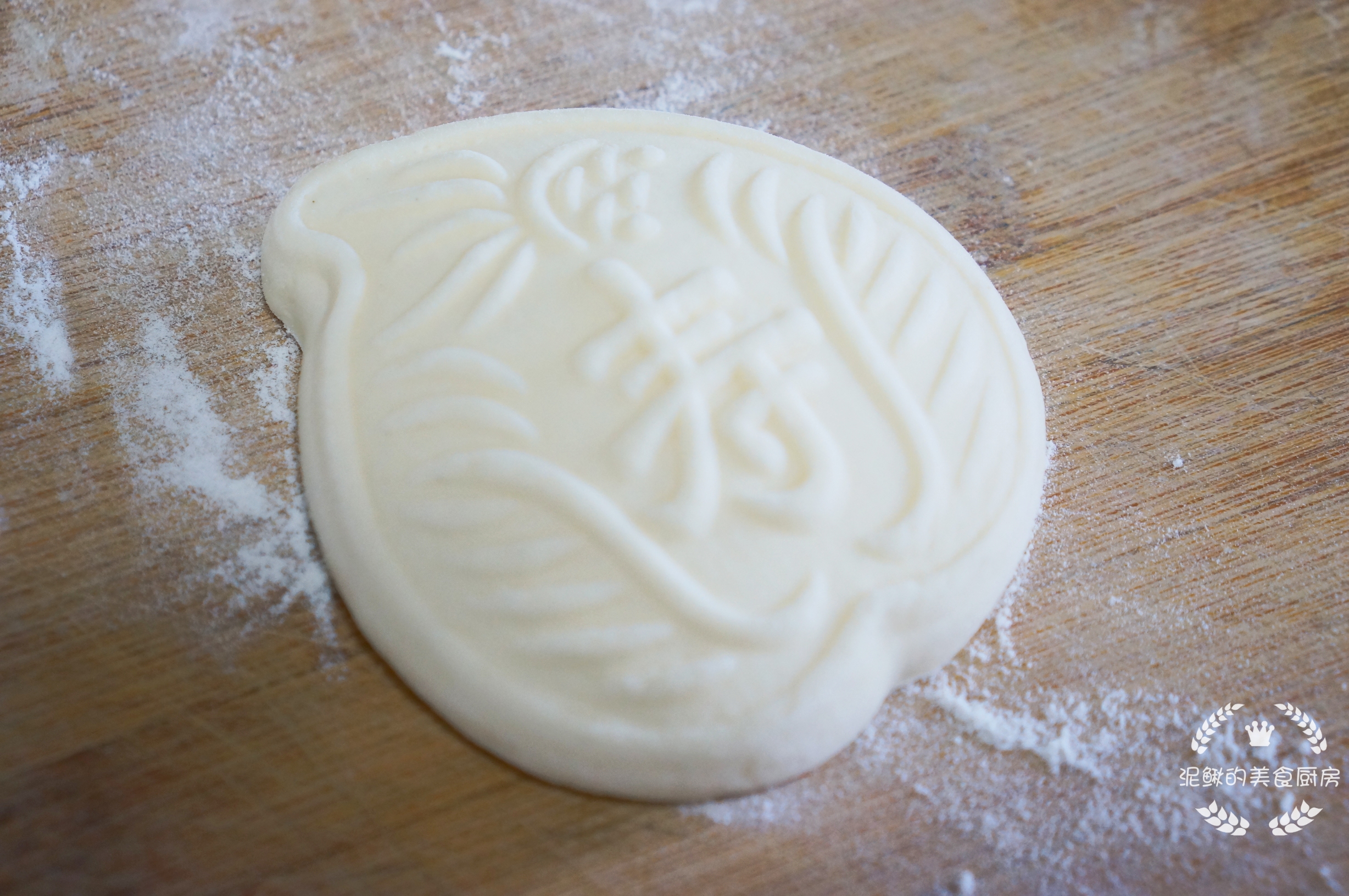步骤4、将面团分成若干小剂子,每个小剂子大概80克。取一个小剂子,在案板上揉光滑并按入模具,按压平整并且压实。模具为了防粘,可以撒一层薄薄的干面粉。
