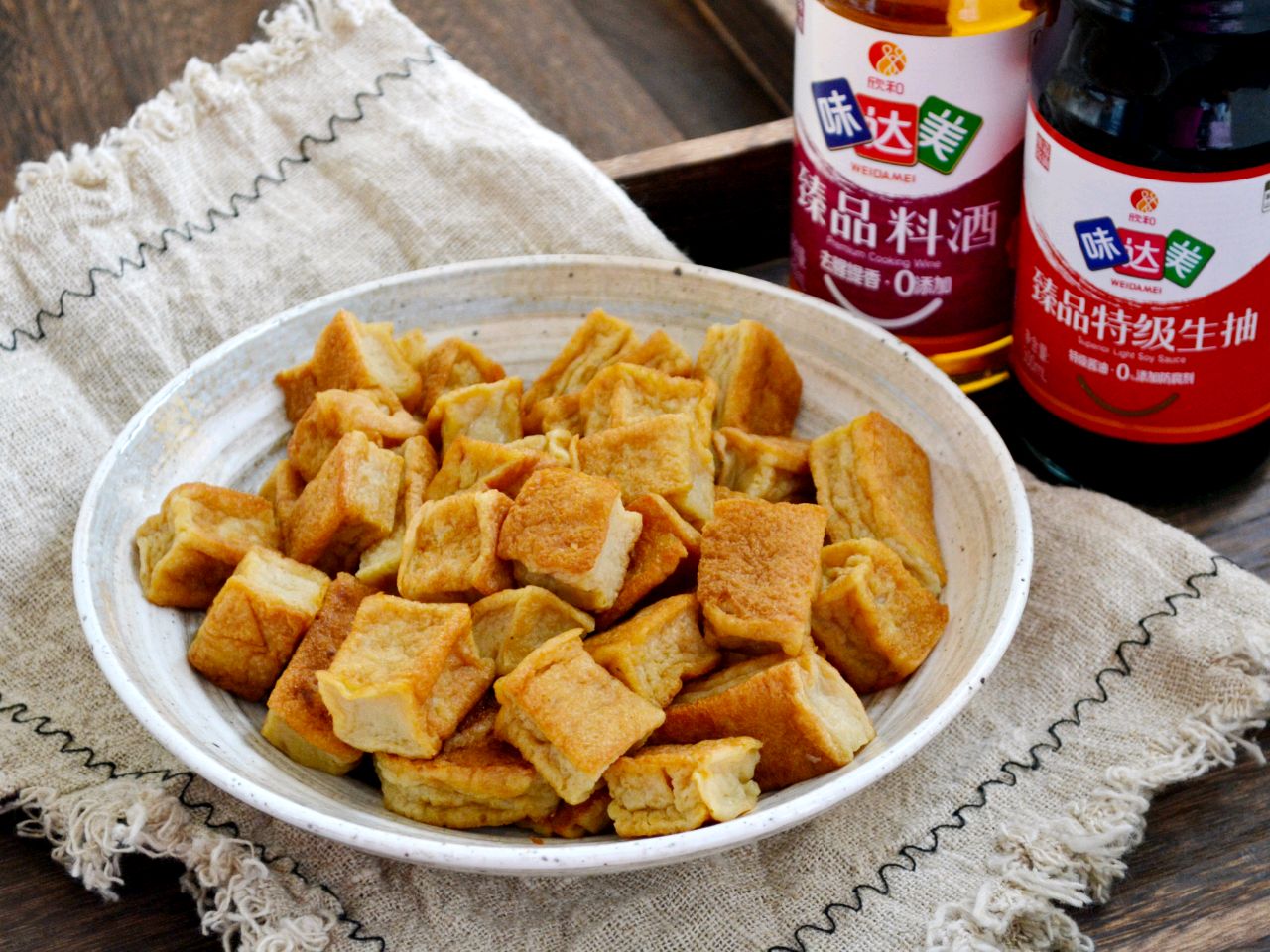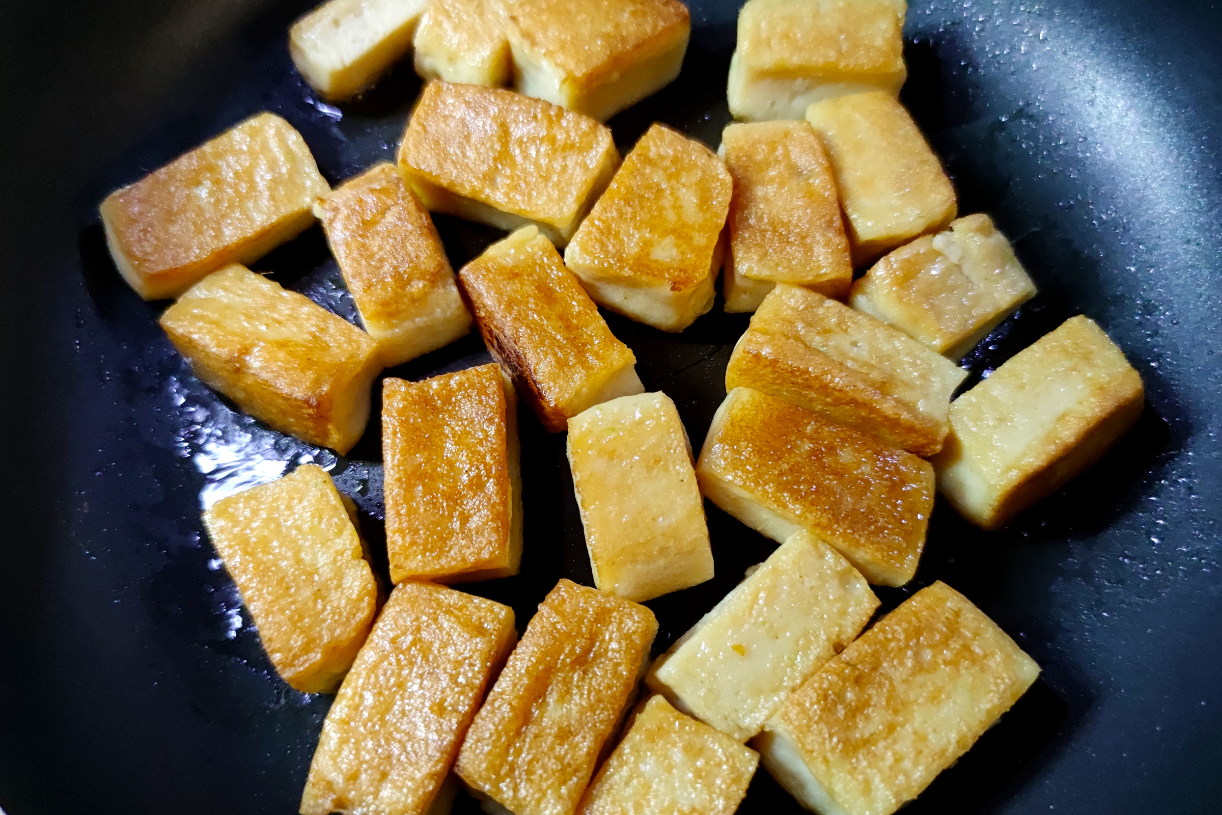 步骤9、平底锅中倒油烧热,放入切好的鱼豆腐块,煎至表面金黄即可。