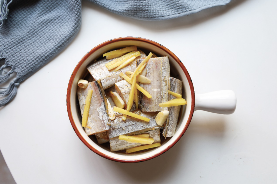 步骤2、加入姜丝蒜片、1勺料酒、1勺生抽、3克胡椒粉,用手揉搓,方便带鱼腌制入味。