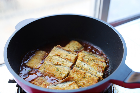 4.煎带鱼怎样不破皮?热锅热油,下入带鱼,刚开始煎的时候不要立即翻动,带鱼不熟的时候很容易粘锅,等表面煎酥脆的时候,就不粘锅底了,所以煎带鱼的时候一定要耐心哦。