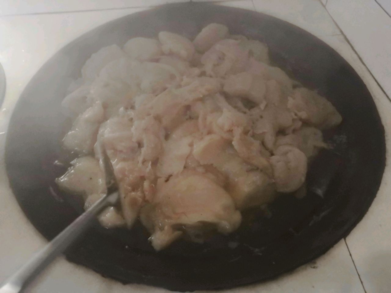 步骤9、第四步:煮魔芋。第一次:用清澈的石灰水煮魔芋。烧开一大锅石灰水,滚沸,然后用铲子把凝固的“面糊”一勺一勺挖入沸腾的石灰水中,煮1小时左右。魔芋煮熟就会浮出水面!!第二次:用清水再煮一遍魔芋。干净的清水,倒入魔芋,再煮一遍。这样,魔芋就算全部完工!沥水,晾凉,然后用干净的桶装干净的冷水,泡着魔芋,这样存放的好处一是把多余的【碱】除去掉(碱太多,嘴巴吃起来不好受!!),水变黄;二是冬天利于存放。