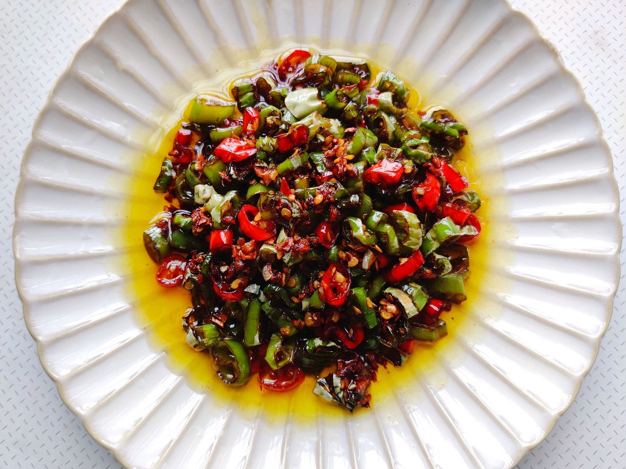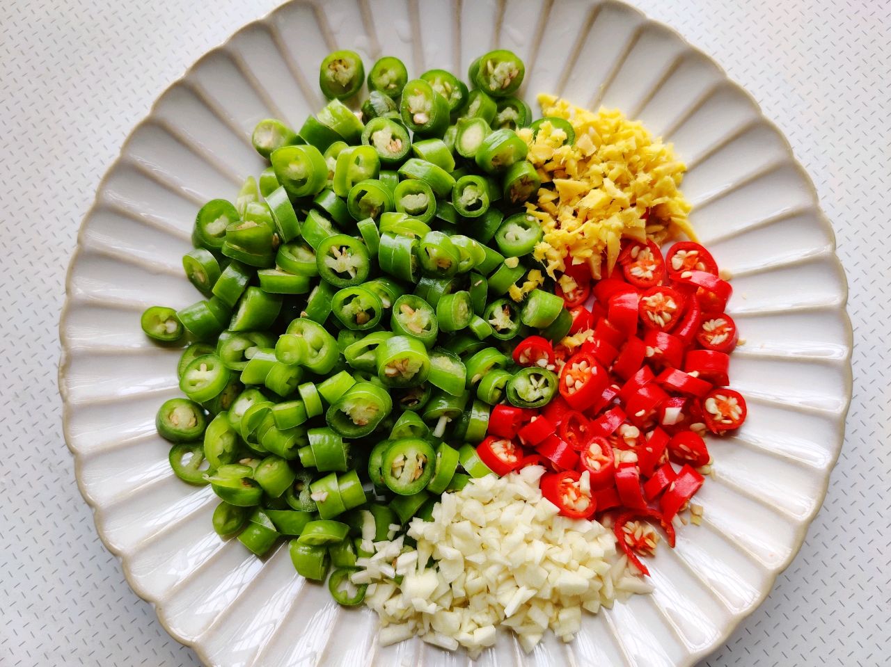步骤2、青尖椒小米椒切圈,姜蒜切细备用。我这个海椒放的多,味道很辣,不喜欢辣的小米椒放少一点。