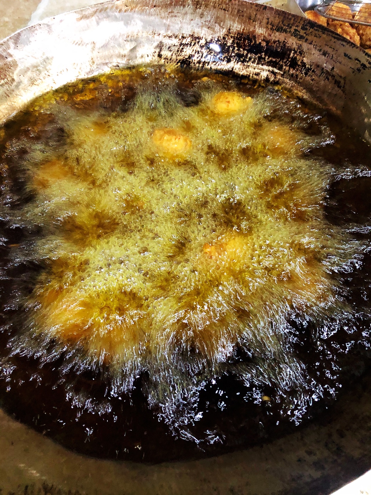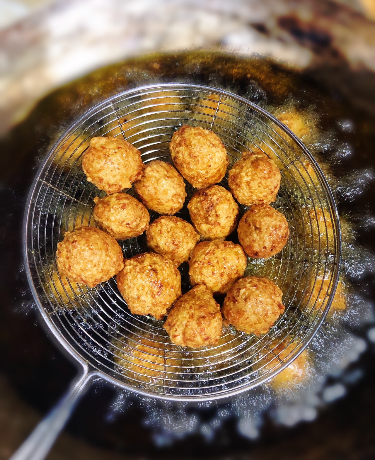 步骤11、圆子炸3-4分钟左右用漏勺把圆子翻动一下
