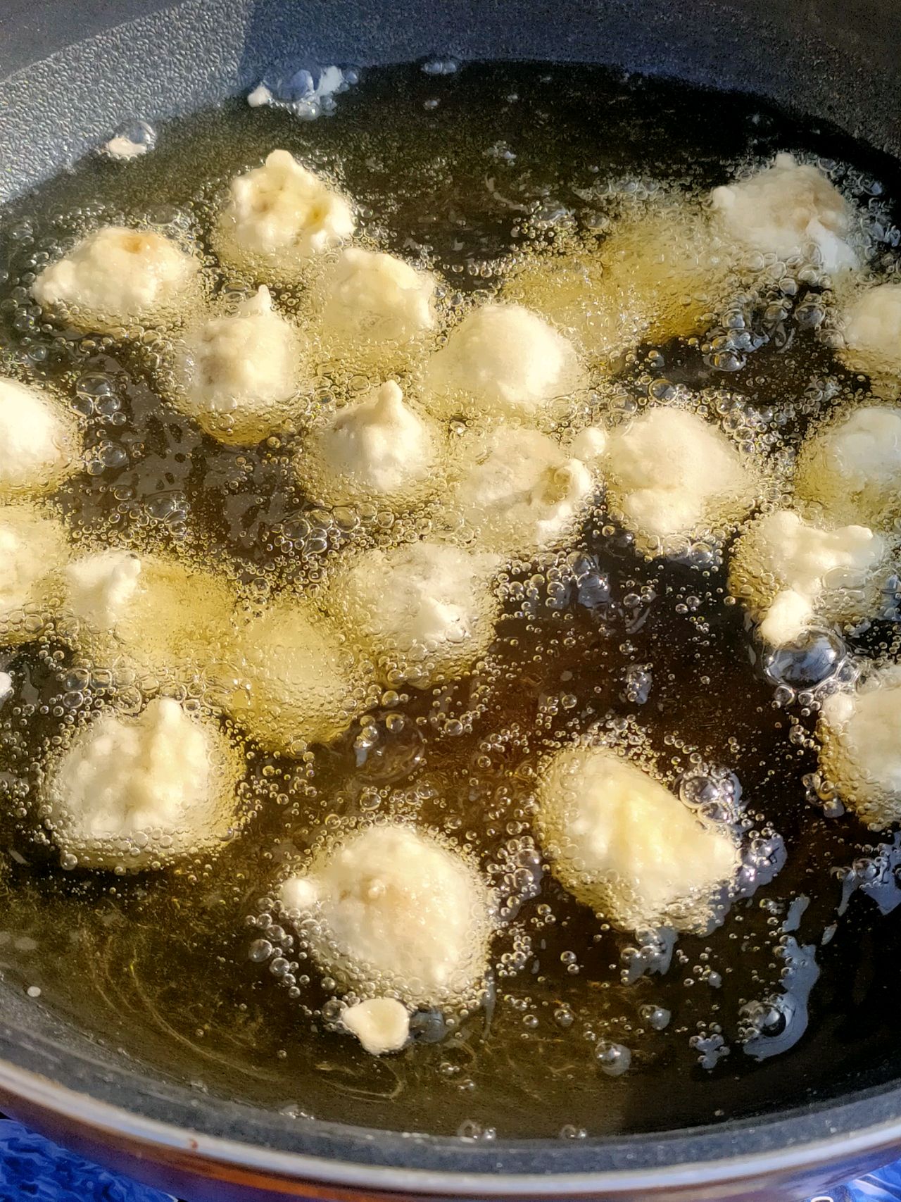 步骤7、把粘有面粉的肉丸放在面糊里裹上面糊放用筷子挑出放油锅里开中火炸至金黄就可以出锅了