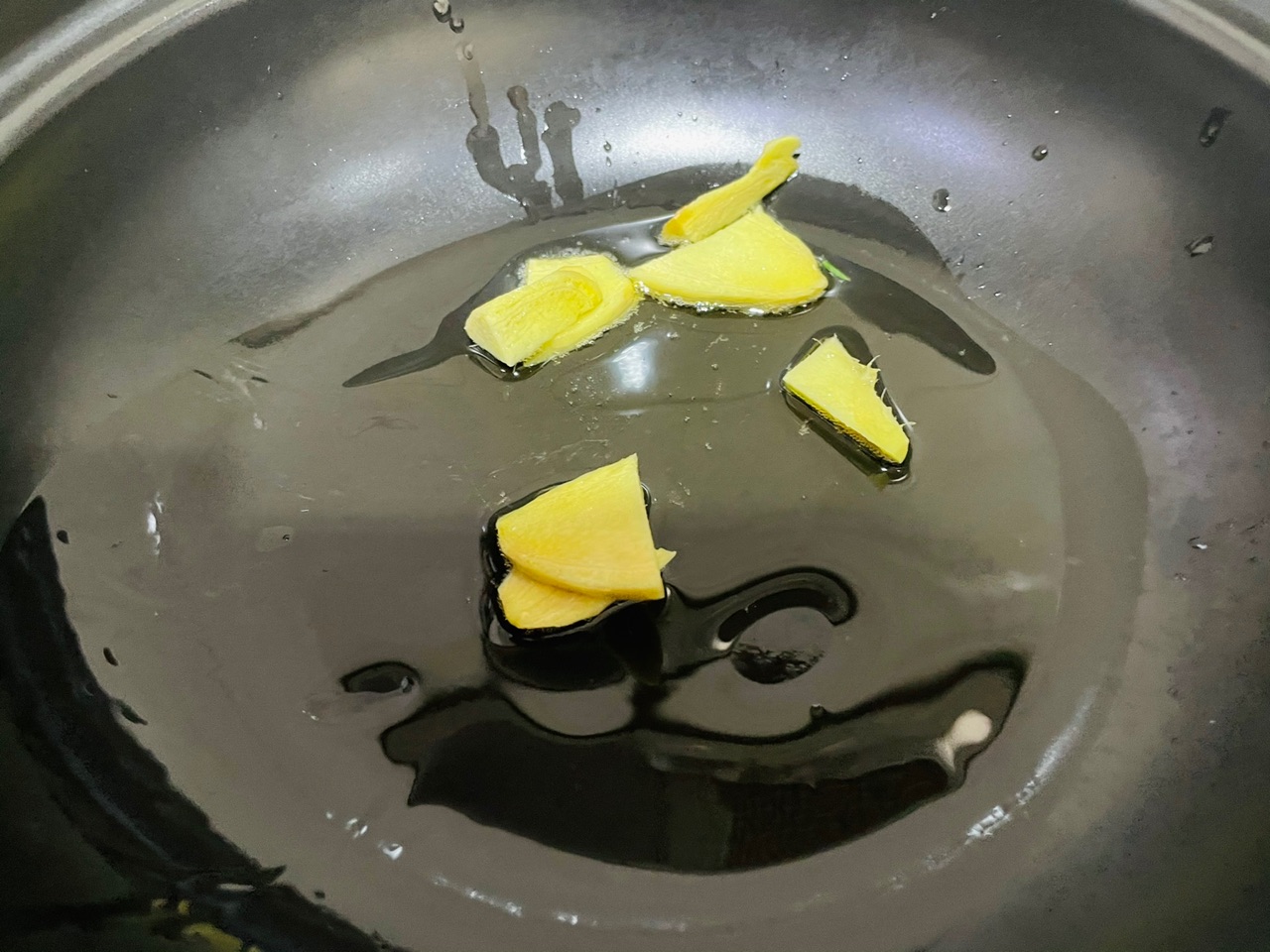 步骤1、锅里烧油,倒入姜片。推荐用砂锅炒,更香。