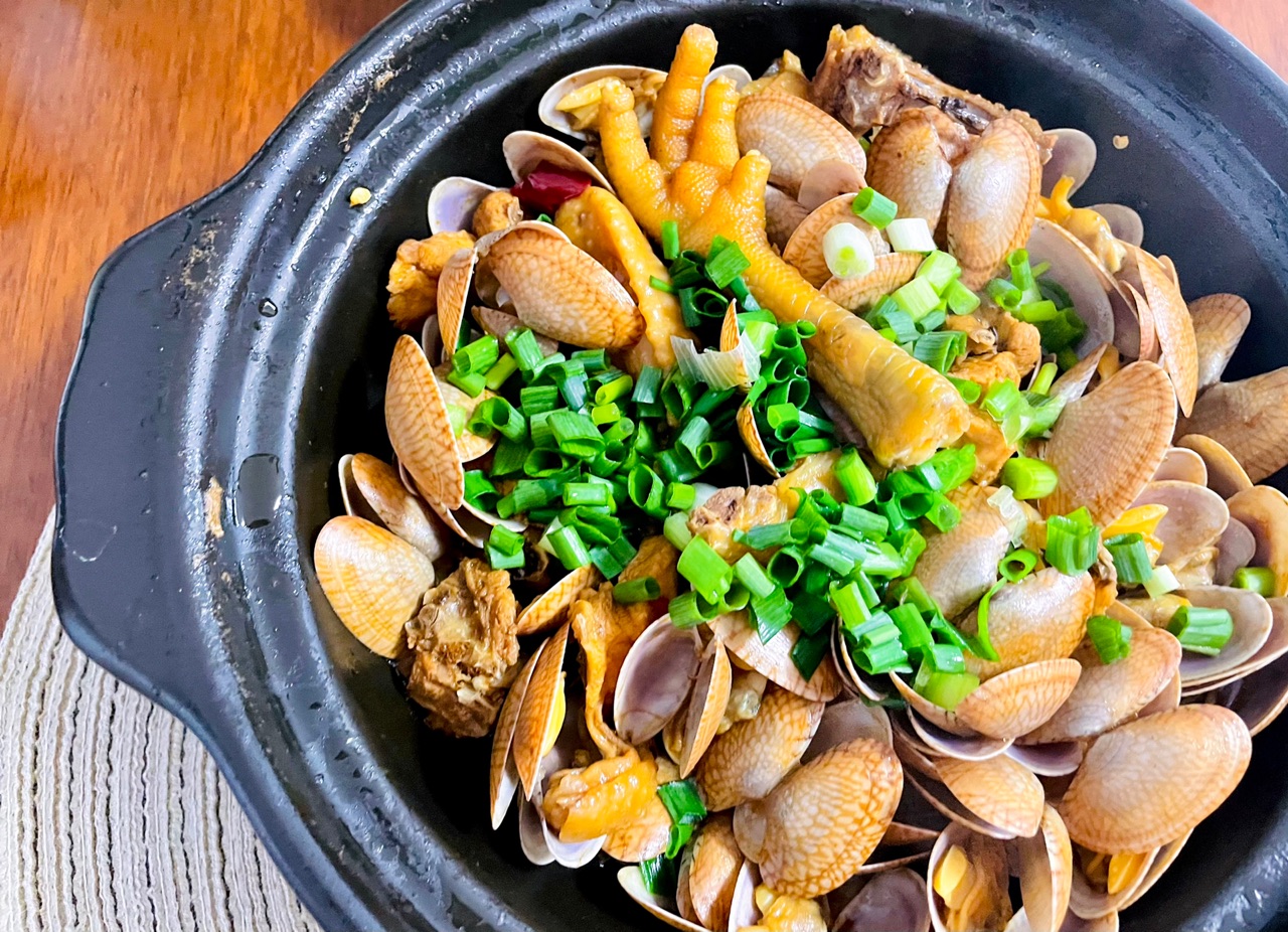 步骤5、再把花甲铺在上面,盖锅盖焖5分钟。