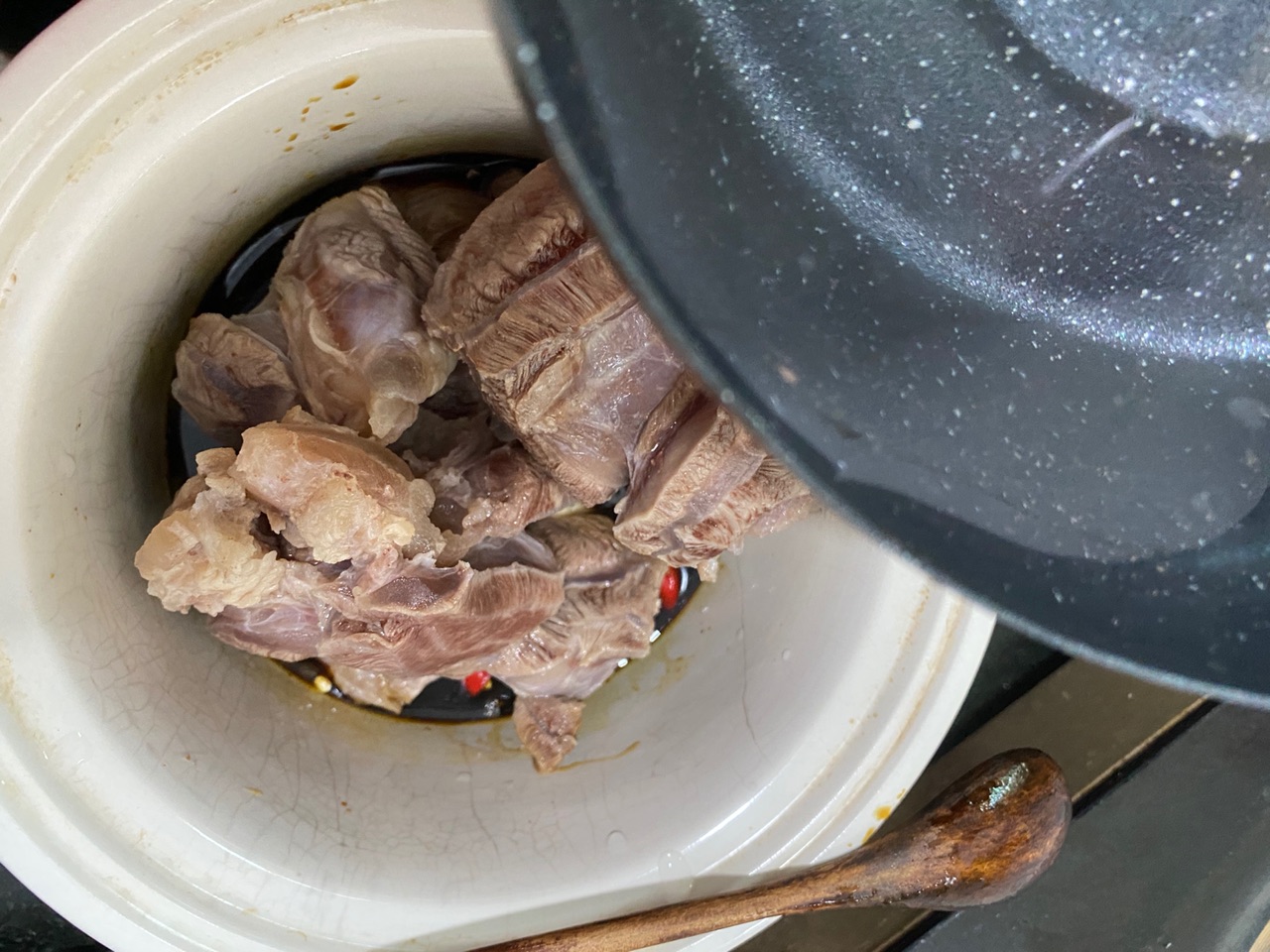 步骤12、加冷水,没过肉,注意这里的调料我是没有加盐的,等到后面尝味道的时候觉得淡可以再加,基本上这样的配比咸淡已经够了。
