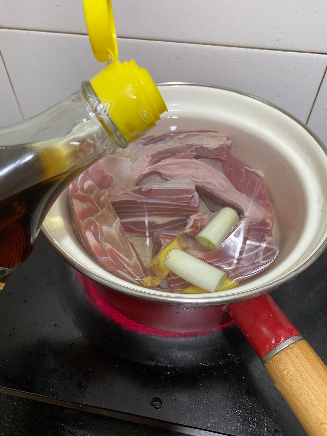 步骤4、冷水开炉灶,下牛腱子,大葱段,厚姜片,料酒一勺。