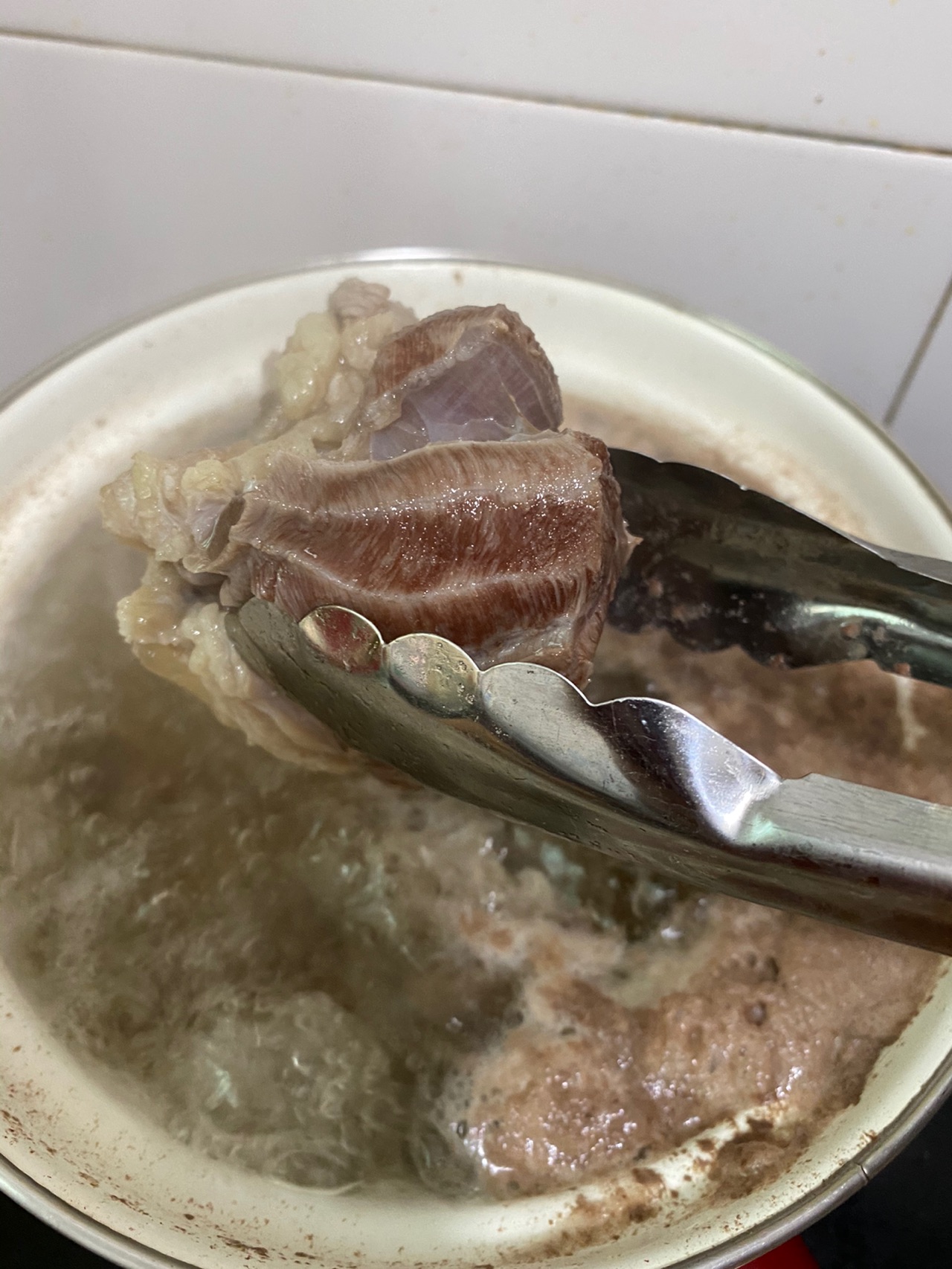 步骤7、水烧开把牛腱子捡出,提前准备一小盆冷水,牛腱子捡出放进冷水,这样汆水的浮末残余就会被洗掉。