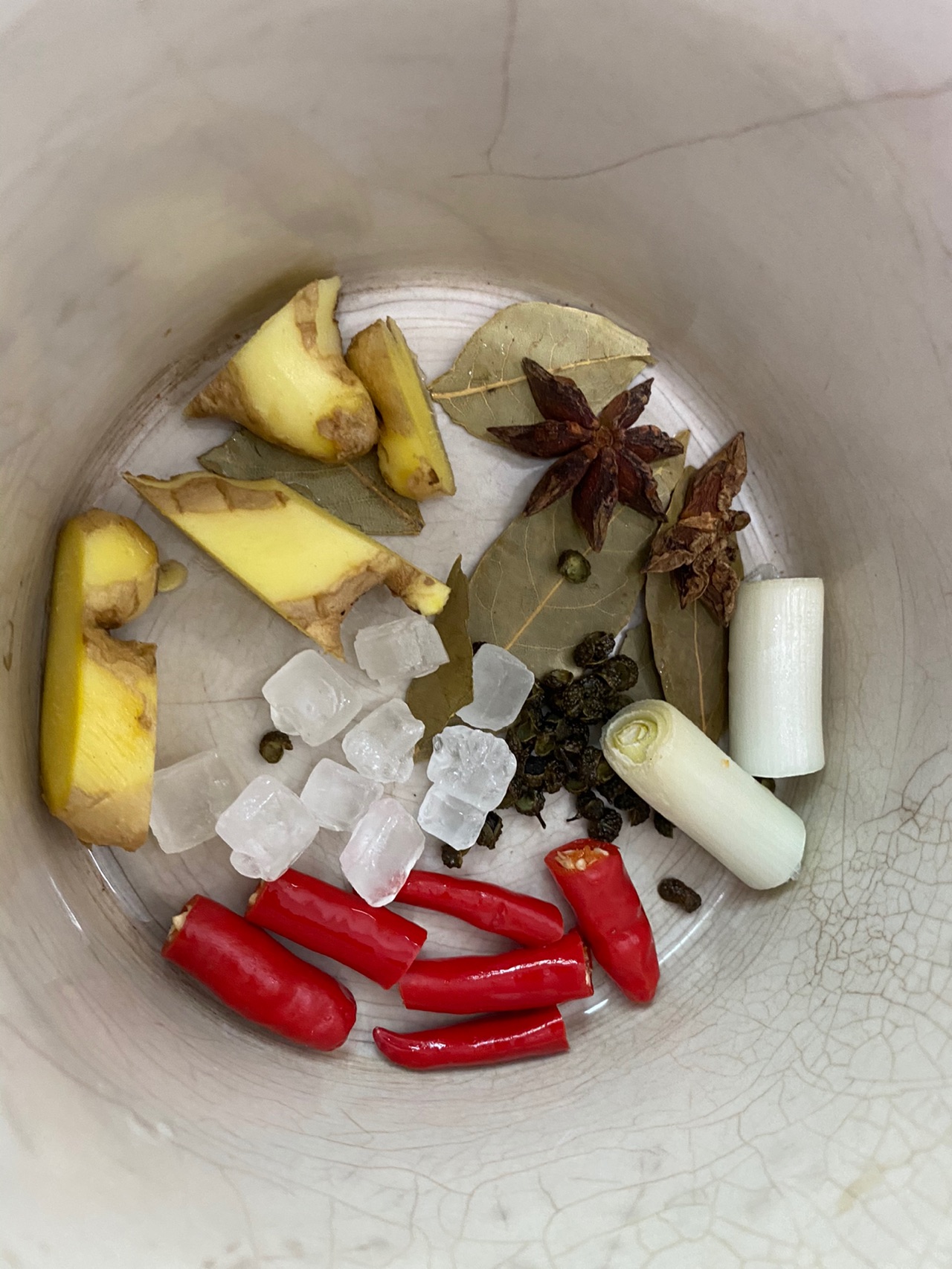 辅料:八角1个、花椒粒15粒、香叶4片、生抽5勺、冰糖10克、老抽1勺、黄豆酱2勺、大葱半根、生姜1块
