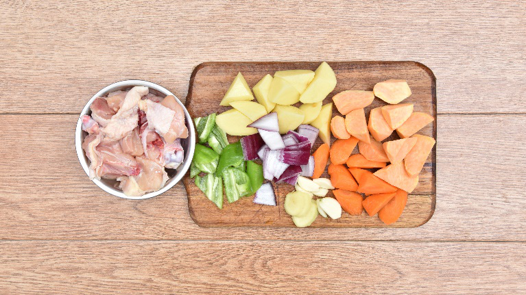 步骤1、将鸡腿洗净切块,红薯、土豆、胡萝卜洗净去皮切滚刀块,洋葱、青椒、姜、蒜切片备用