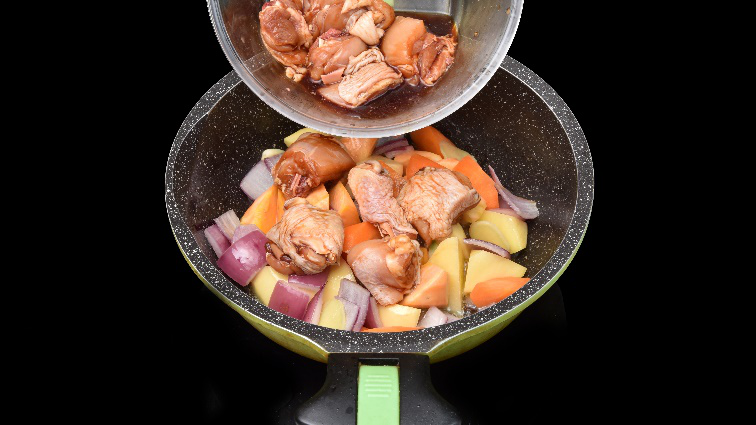 步骤7、倒入腌制的酱汁、少量的水,盖上锅盖焖煮10分钟