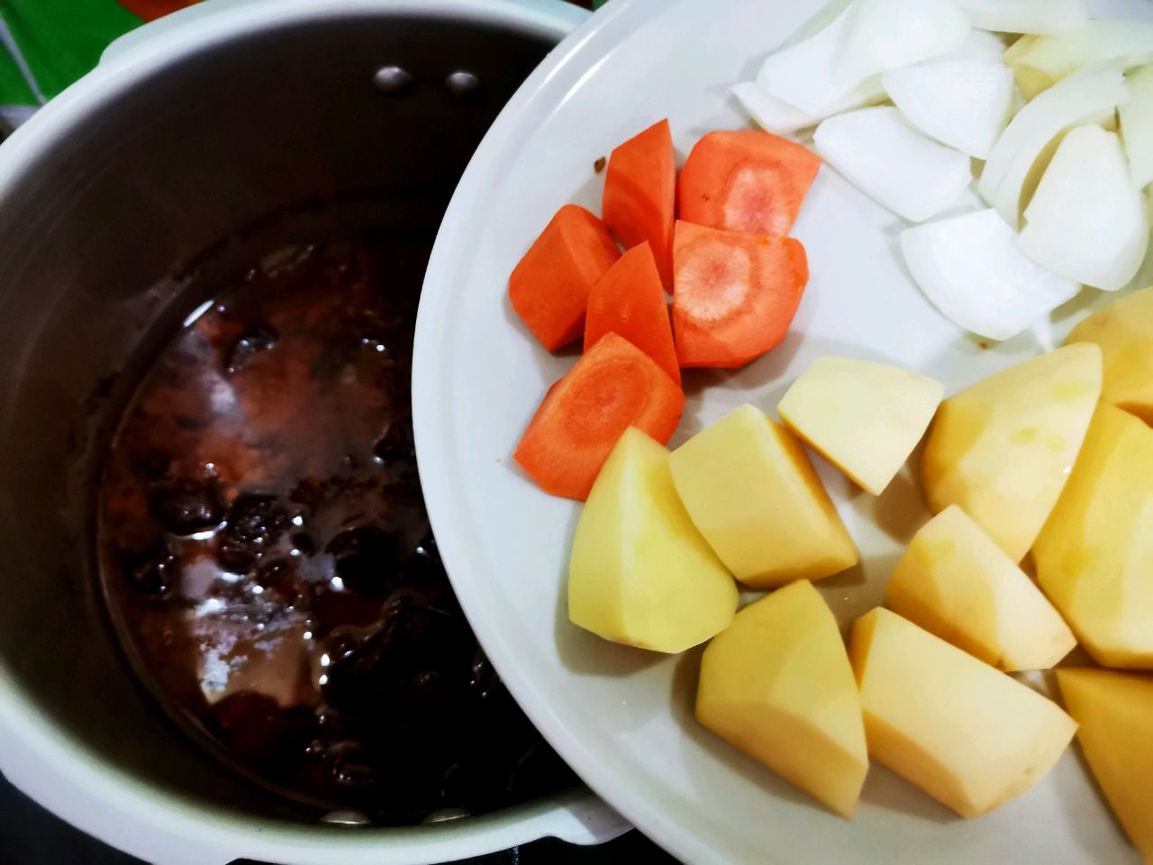 辅料:洋葱半个、胡萝卜半根、香叶,桂皮,干辣椒。适量、料酒1勺、红烧酱油1勺、盐适量、麻辣火锅底料适量