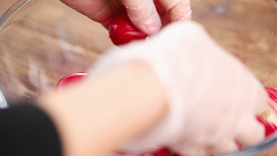 步骤3、切好的樱桃萝卜放入盆中,撒入5g食盐,逐个搓一搓挤一挤萝卜内的水分。