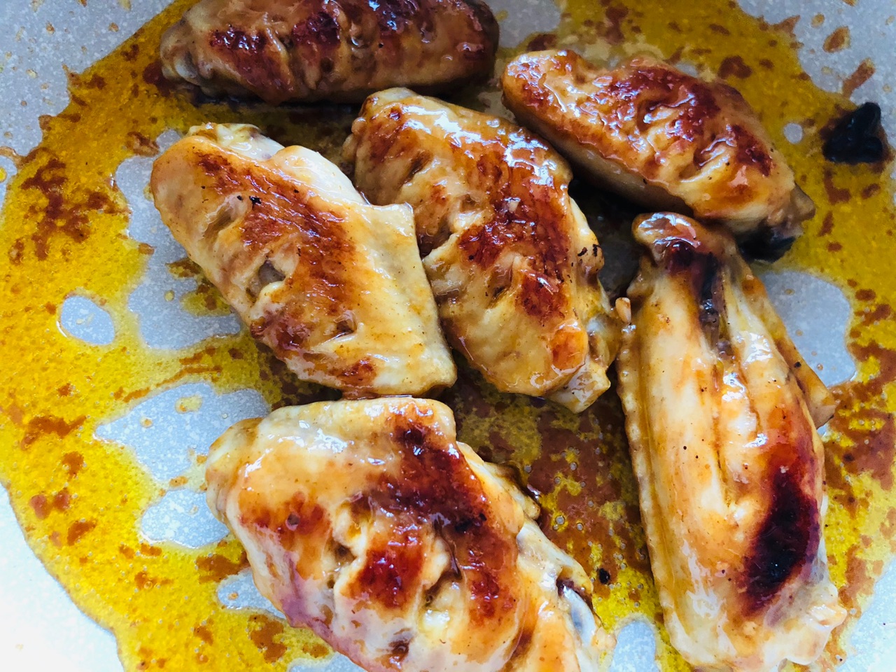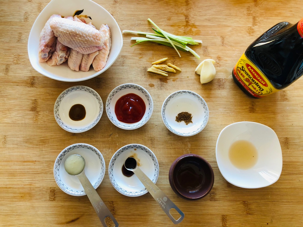 辅料:配料:、葱(腌鸡翅用)少许、姜(腌鸡翅用)2片、蒜(腌鸡翅用)少许、食盐(腌鸡翅用)少许、料酒(腌鸡翅用)少许、八角(煎鸡翅用)1个、酱汁:、番茄沙司2勺、蚝油1丢丢、蜂蜜1丢丢、孜然粉少许、咖喱粉少许、料酒少许、清水少许、香油少许、美极鲜味汁少许