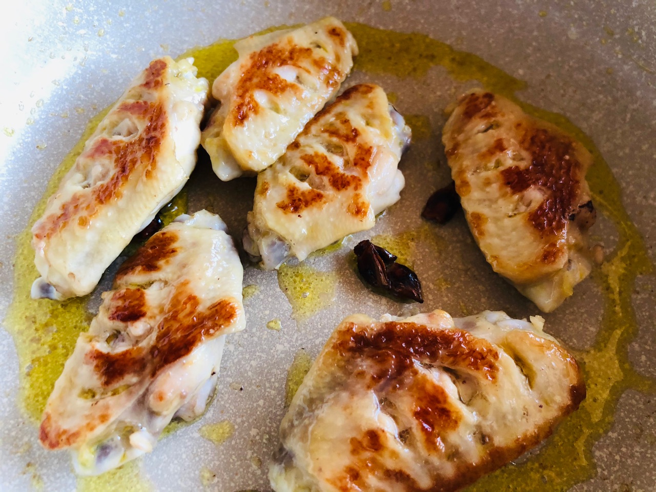 步骤9、锅中倒入少许食用油、油温3、4成热时放入鸡翅煎至底部上色。