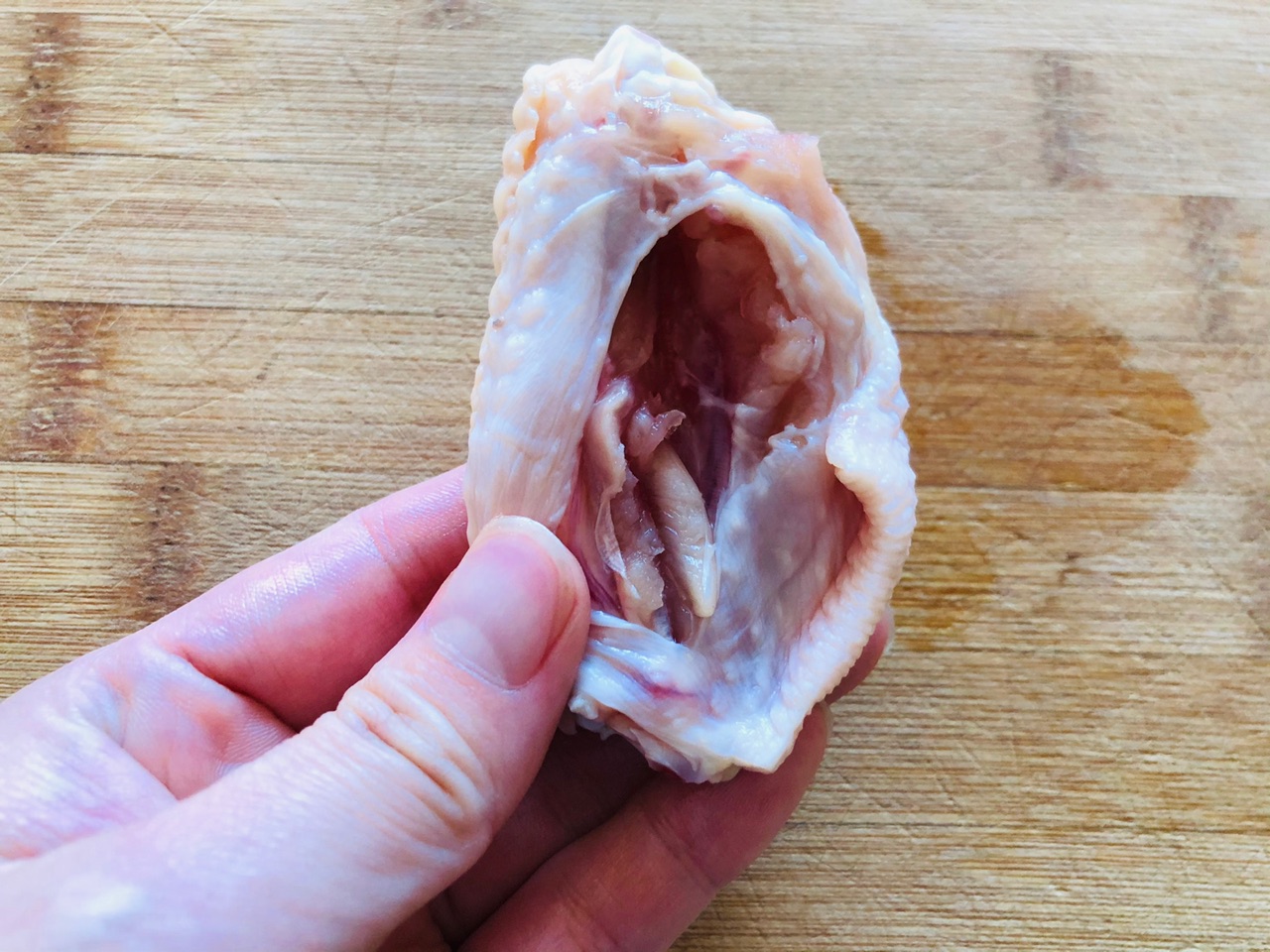 步骤3、然后把鸡翅翻面,底部打一字花刀,底部的肉比较厚,所以划的尽量深一些,方便泡的时候也可以把里面的血水泡出来,也方便烹饪的时候入味。