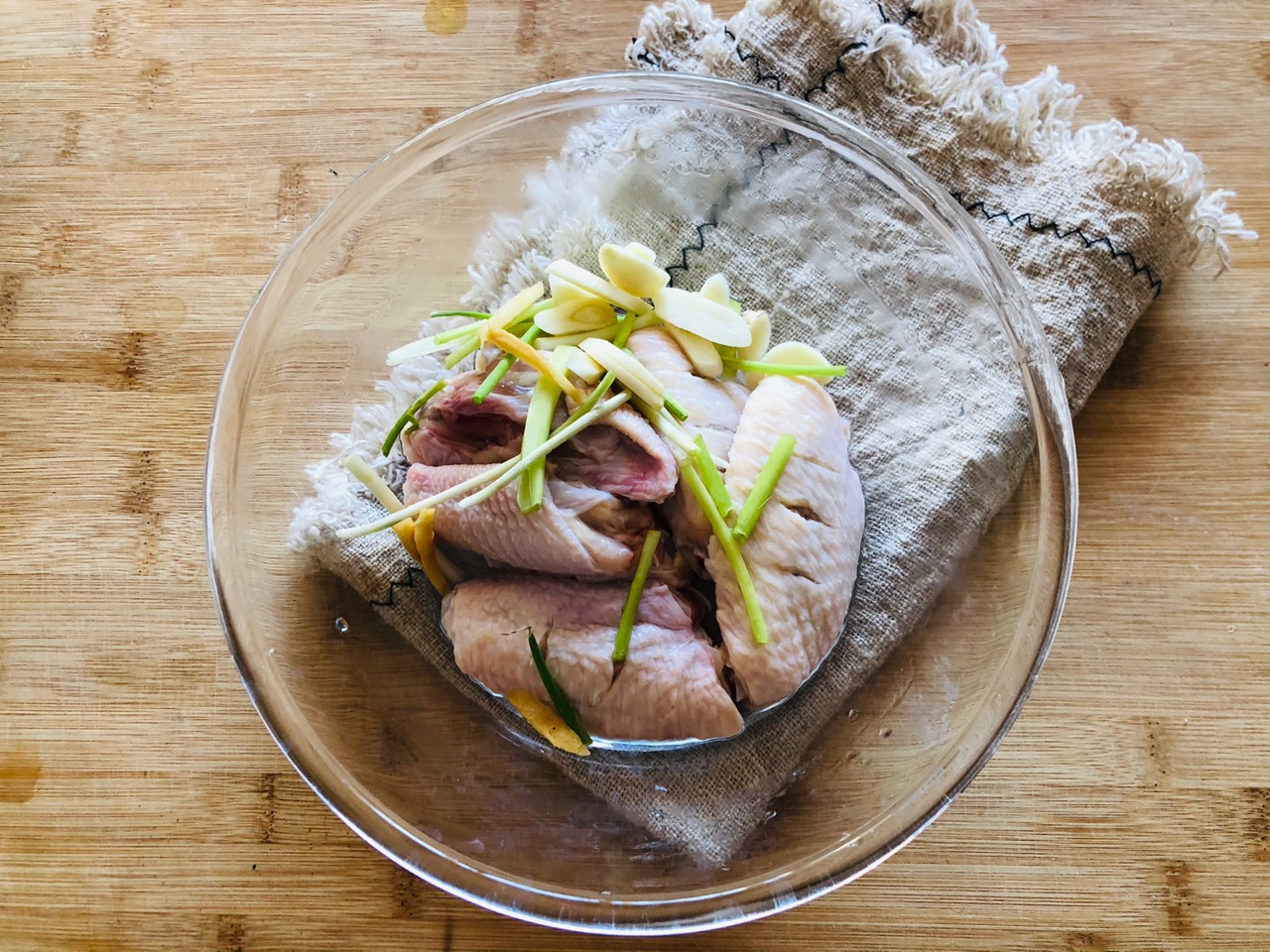 步骤5、鸡翅泡好后捞出沥干水分,放入葱、姜、蒜片、食盐、料酒、少许蜂蜜用手抓拌均匀,尽量多抓拌一会,让食材的味道进入鸡翅里面去掉鸡翅的腥味。家里有花雕酒的可以放花雕酒。