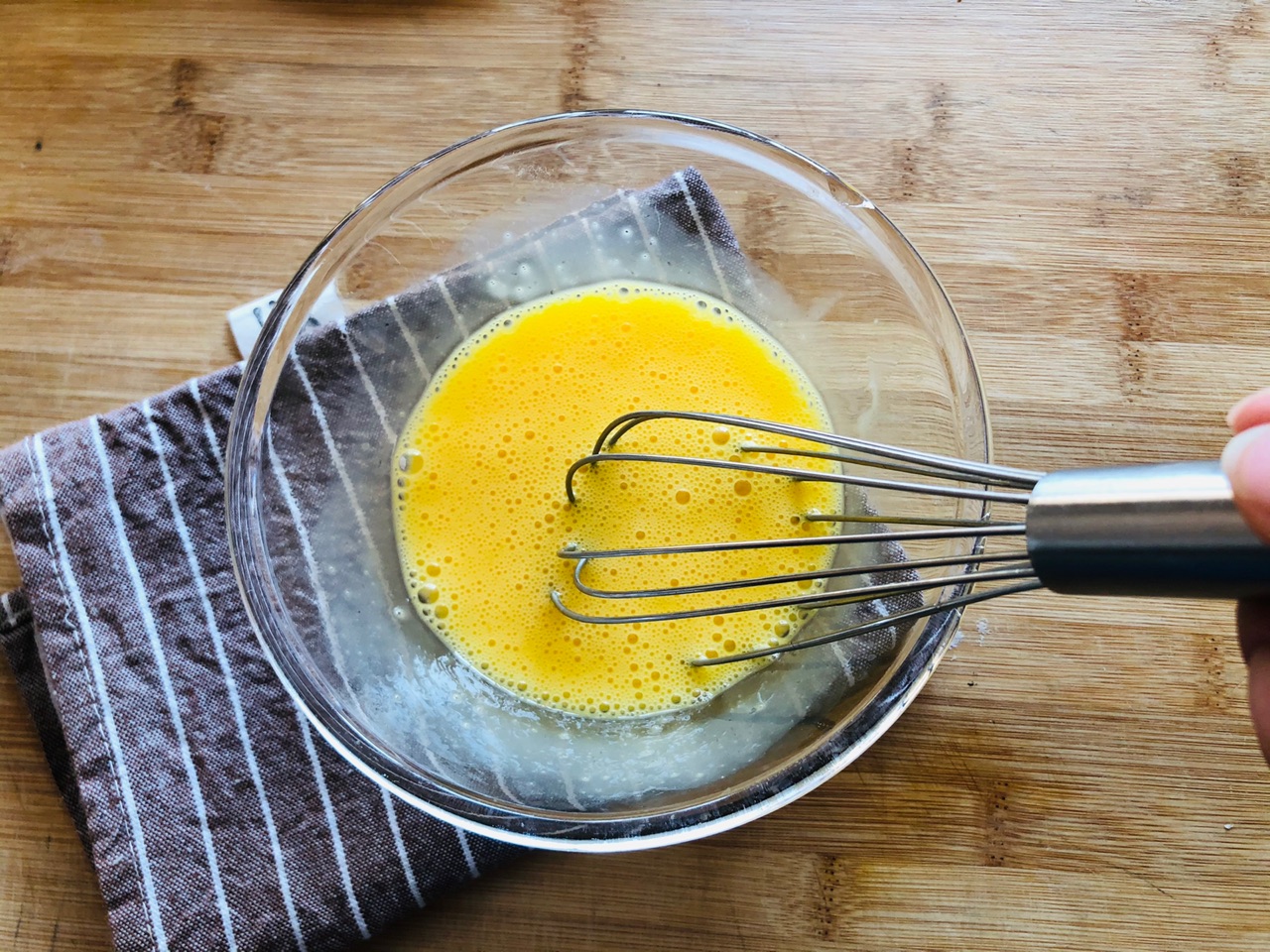 步骤3、用蛋抽打散鸡蛋里的筋膜。鸡蛋里的筋膜一定要完全打散且搅拌均匀。