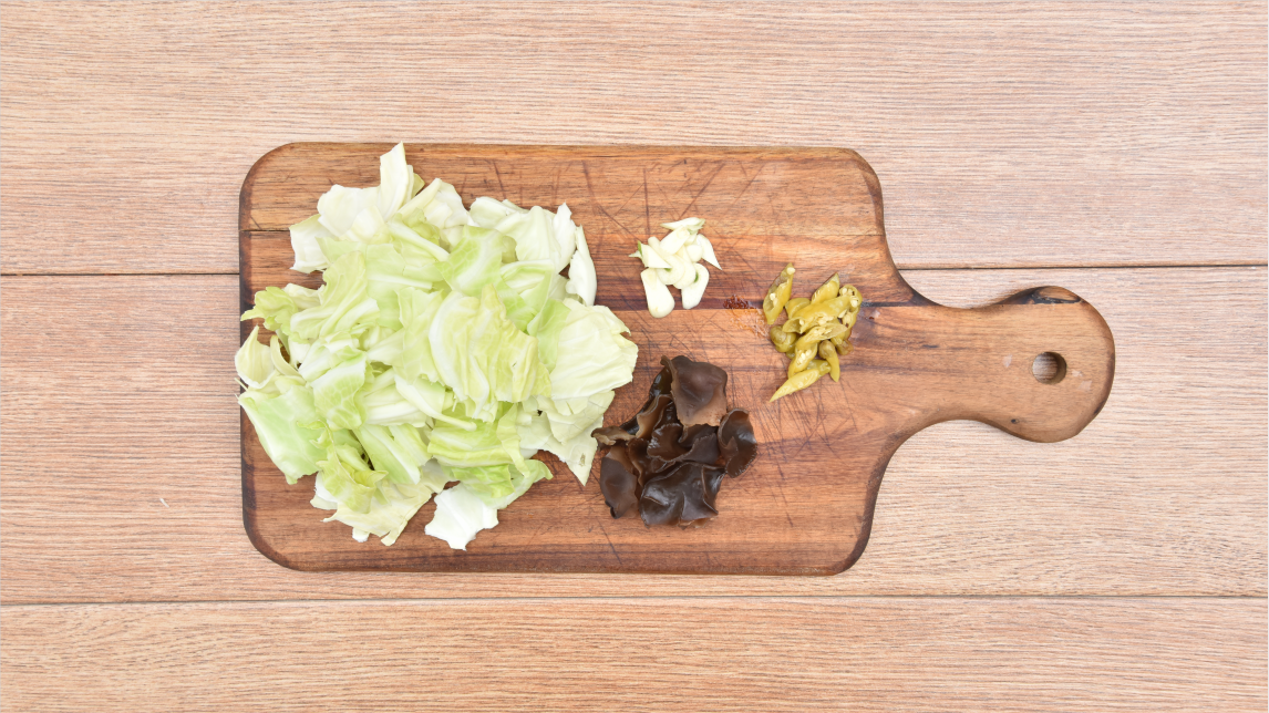 步骤1、卷心菜、木耳洗净撕成小片,蒜、泡椒切片