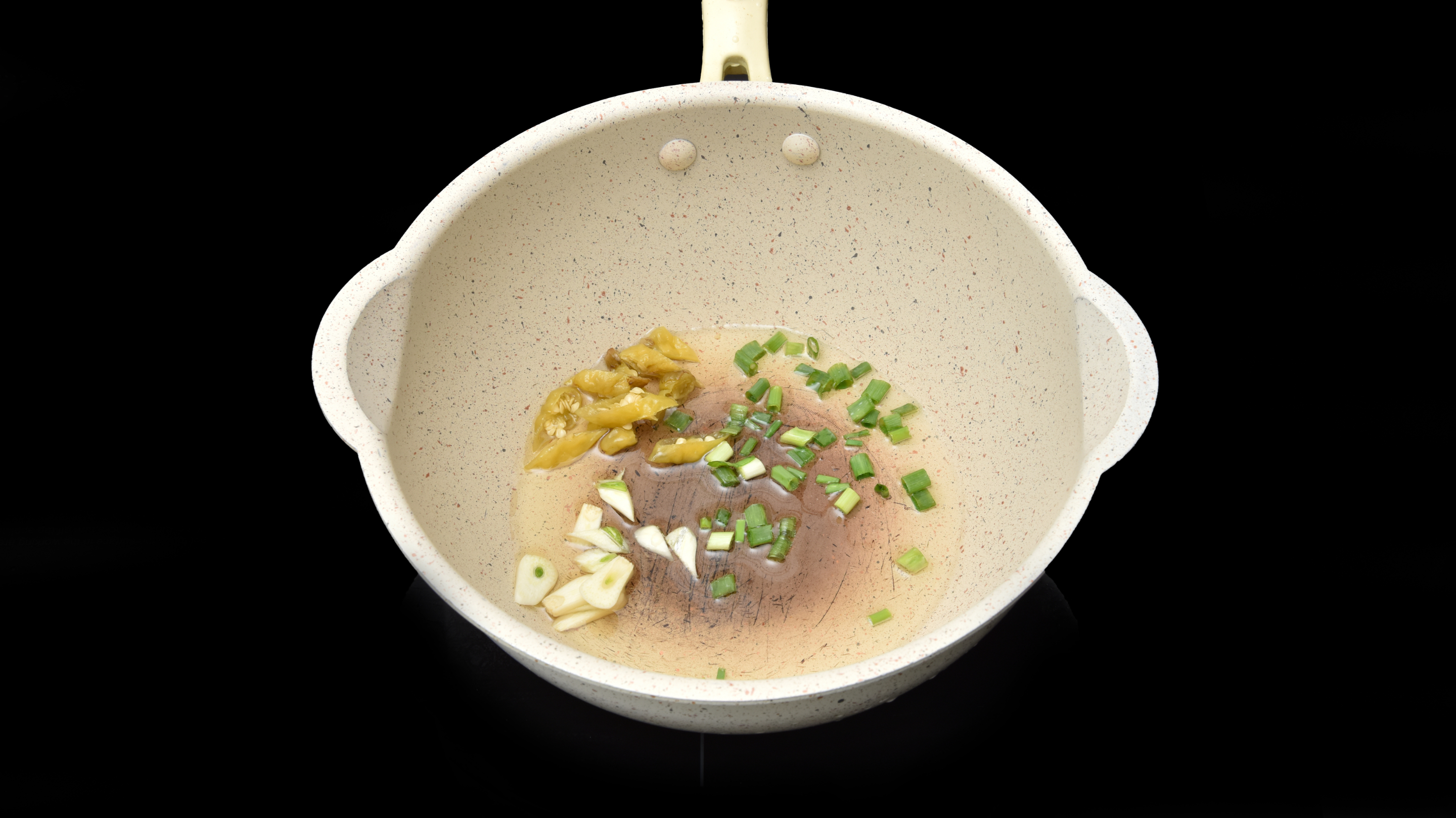 步骤2、炒锅注油烧热,下入葱花、花椒、蒜炒香