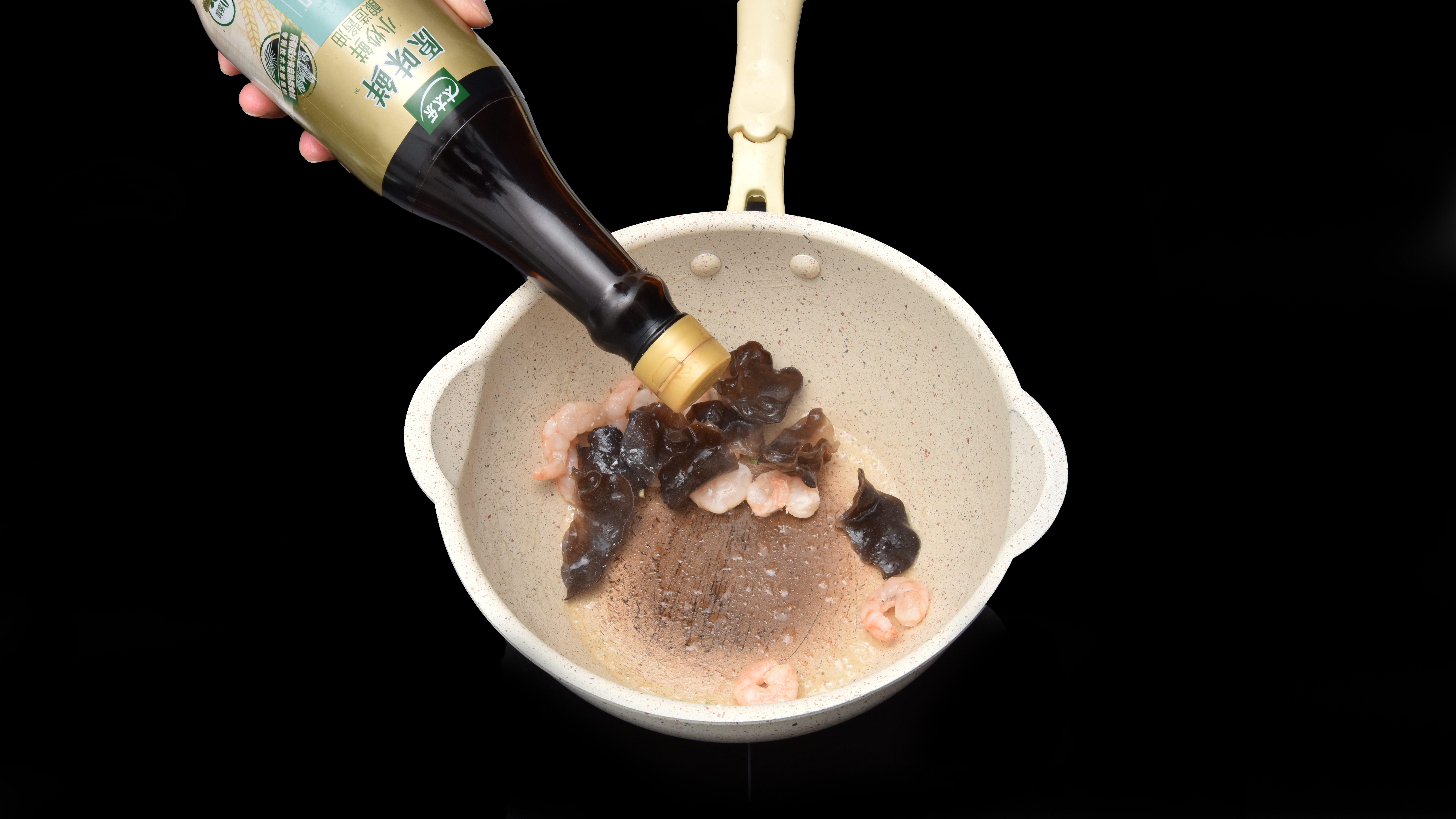 步骤4、炒锅注油烧热,放虾仁、木耳炒熟