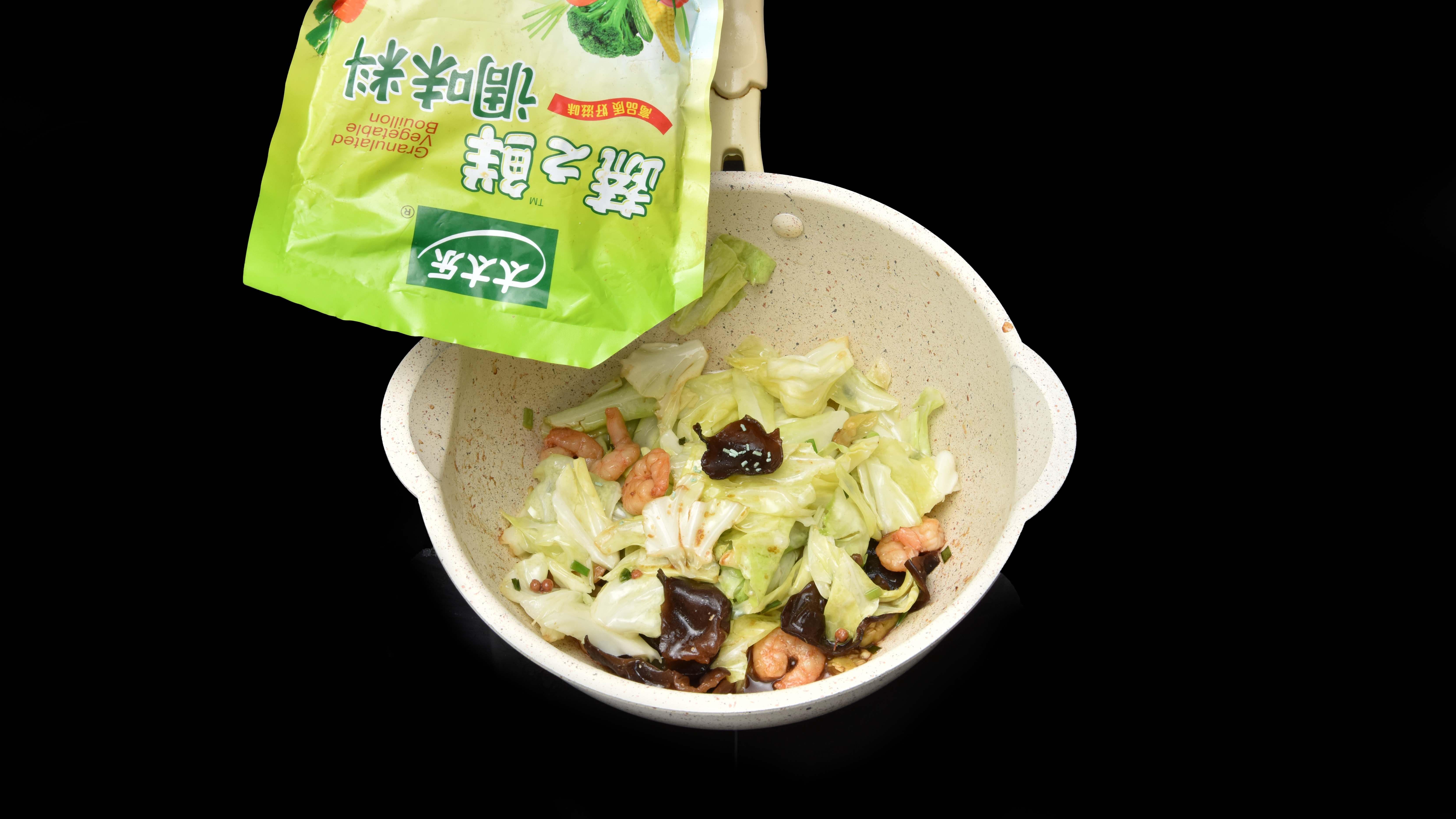 步骤6、倒入卷心菜一起翻炒;加入“太太乐原味鲜”蔬鲜调味料调味即可享用