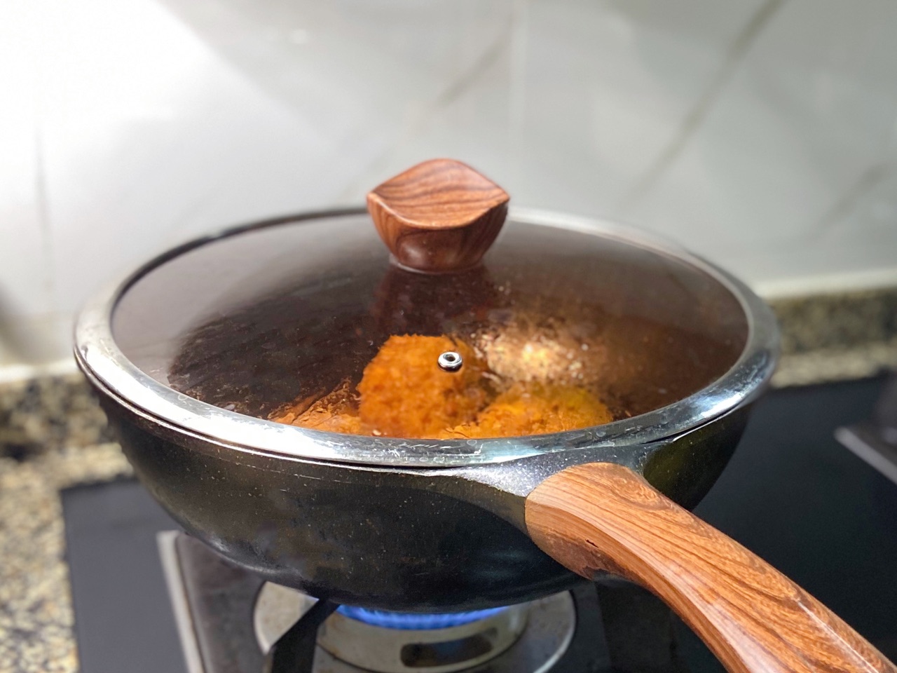 步骤7、锅中烧热油,7分热时将包好的丸子下锅炸。