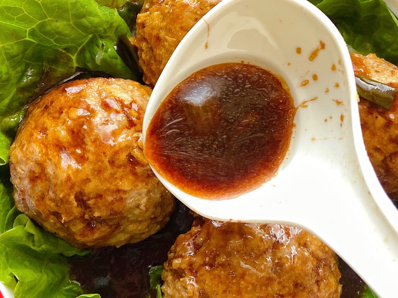 步骤12、大火收汁后将丸子捞出,剩余的汤汁加少许淀粉水勾芡浇在摆好盘的丸子上。