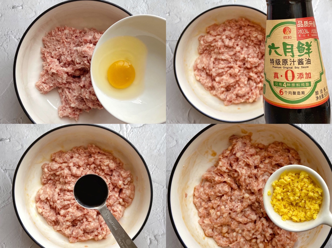 步骤3、将肉末装入大碗中,加入鸡蛋、六月鲜特级原汁酱油、姜末、胡椒粉搅拌均匀。