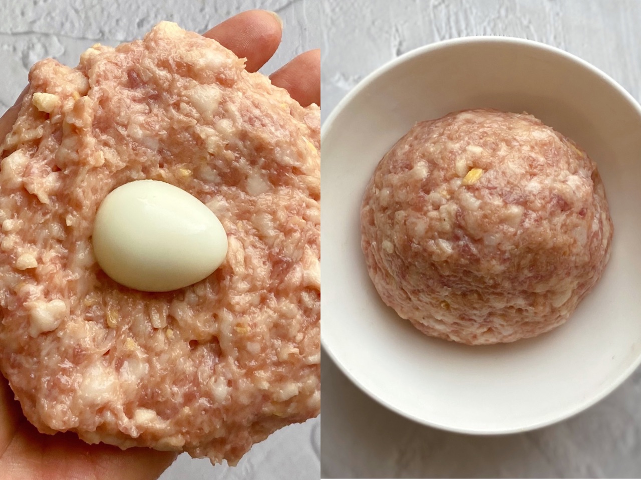 步骤6、取适量肉末(分4份),中间包入煮熟的鹌鹑蛋(煮熟去壳),包成大圆丸子。
